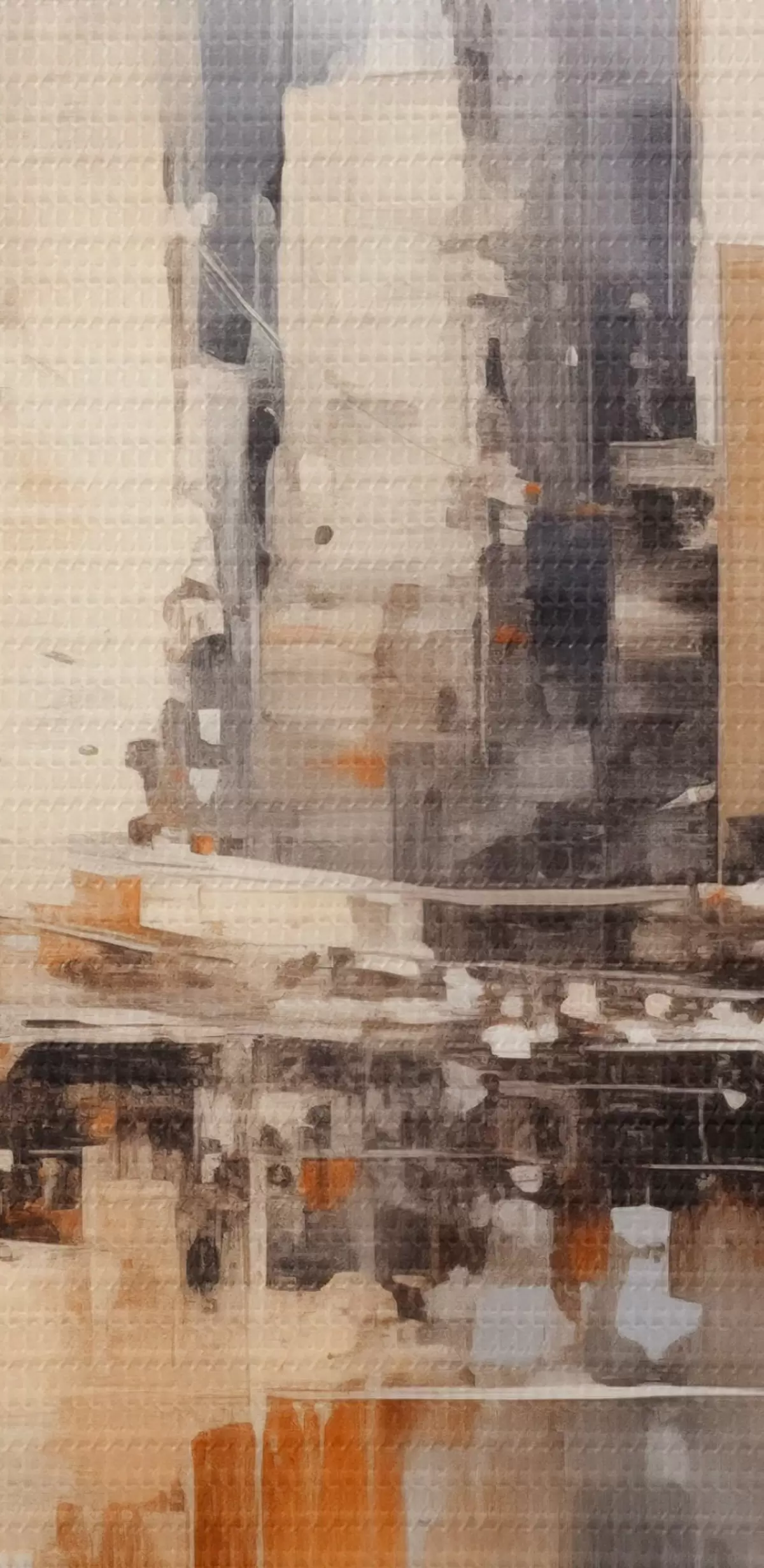 Ronde schilderijen Abstract stadsgezicht met hoge gebouwen in bruine, grijze en witte tinten, weerspiegeld in het water eronder Nr r43168