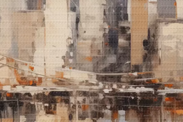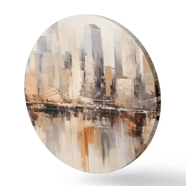 Ronde schilderijen Abstract stadsgezicht met hoge gebouwen in bruine, grijze en witte tinten, weerspiegeld in het water eronder Nr r43168