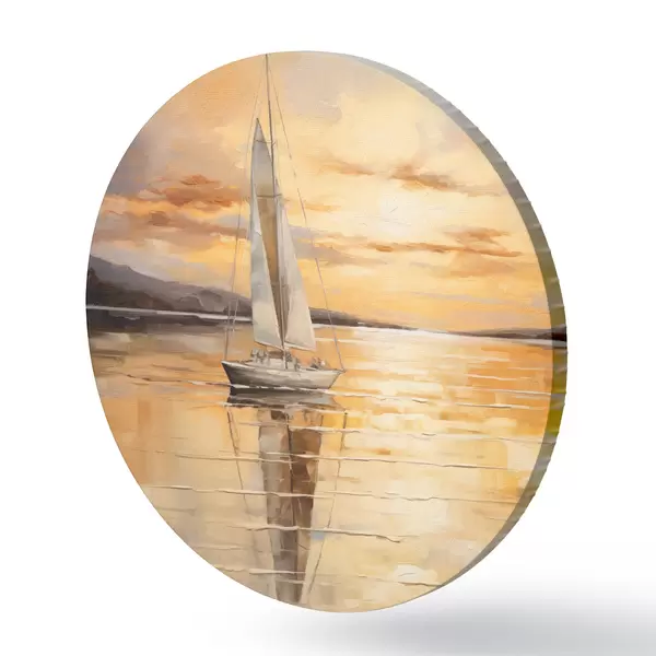 Ronde schilderijen Landschapschilderij met een zeilboot op een kalme zee, oranje en gele lucht, bergen in de verte Nr r43169
