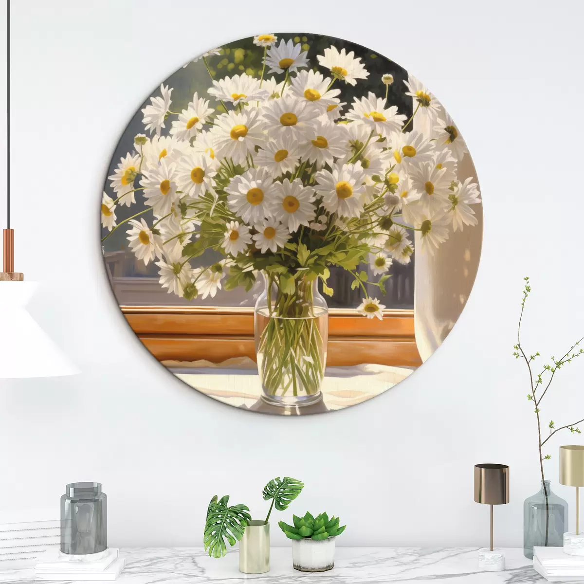 Ronde schilderijen Olieverfschilderij imitatie van een vaas met witte madeliefjes op een vensterbank, zonnige dag, warm kleurenpalet r43171