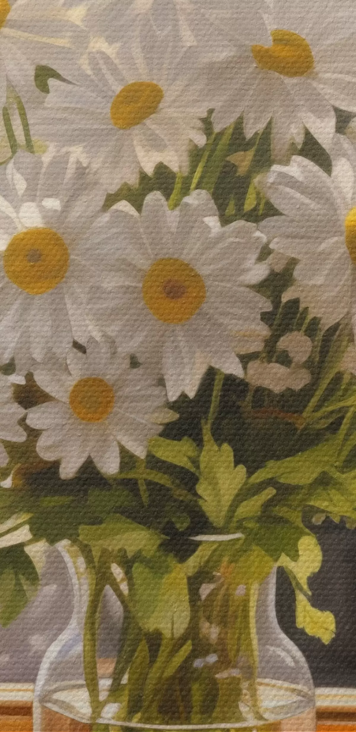 Ronde schilderijen Olieverfschilderij imitatie van een vaas met witte madeliefjes op een vensterbank, zonnige dag, warm kleurenpalet Nr r43171