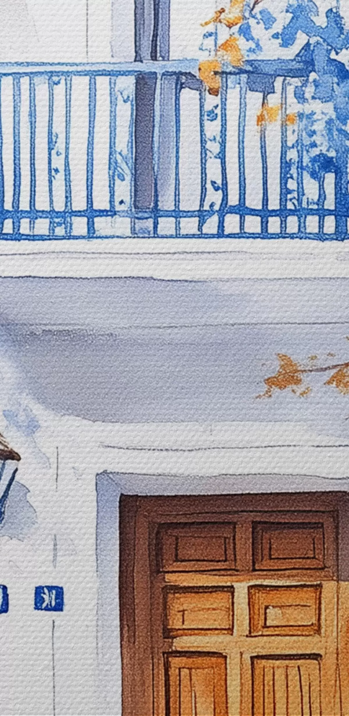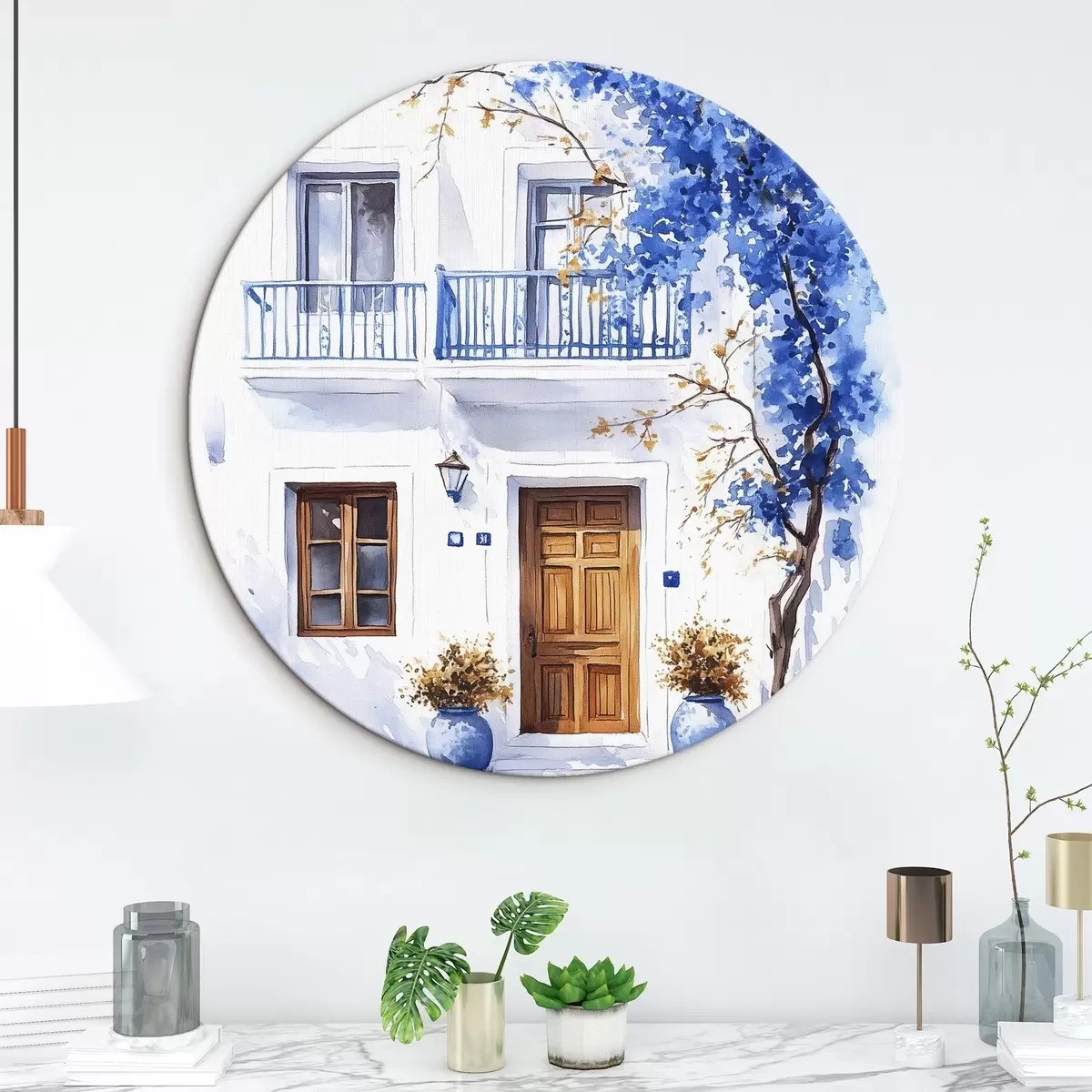 Ronde schilderijen Bloeiende boom met blauwe bloemen, wit huis, Griekenland, aquarel stijl Nr r43183