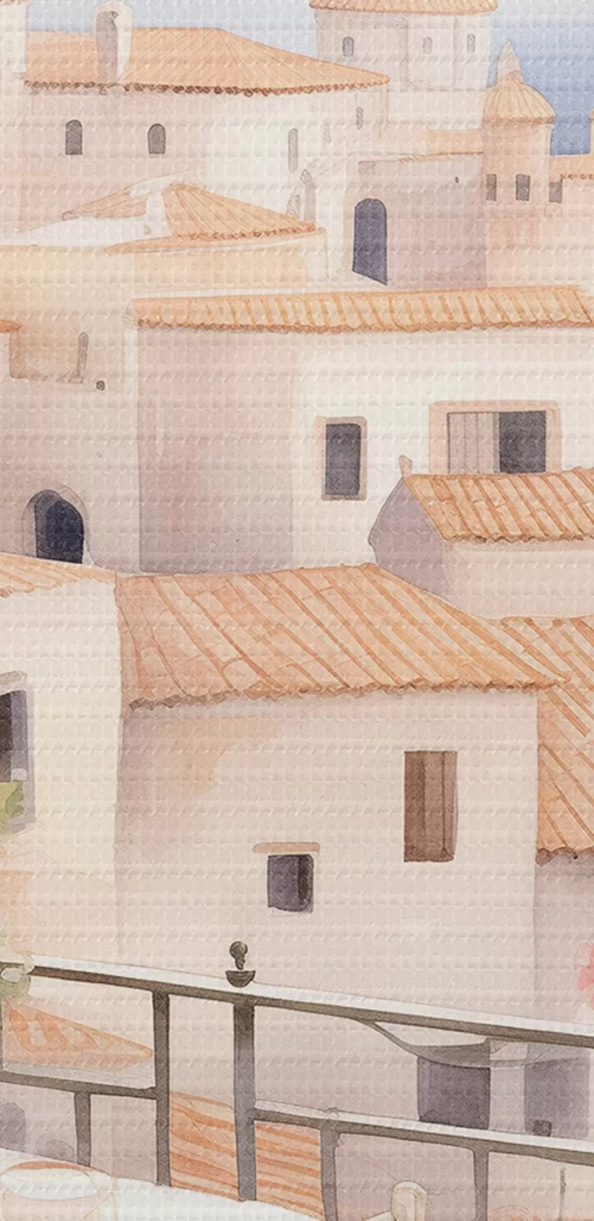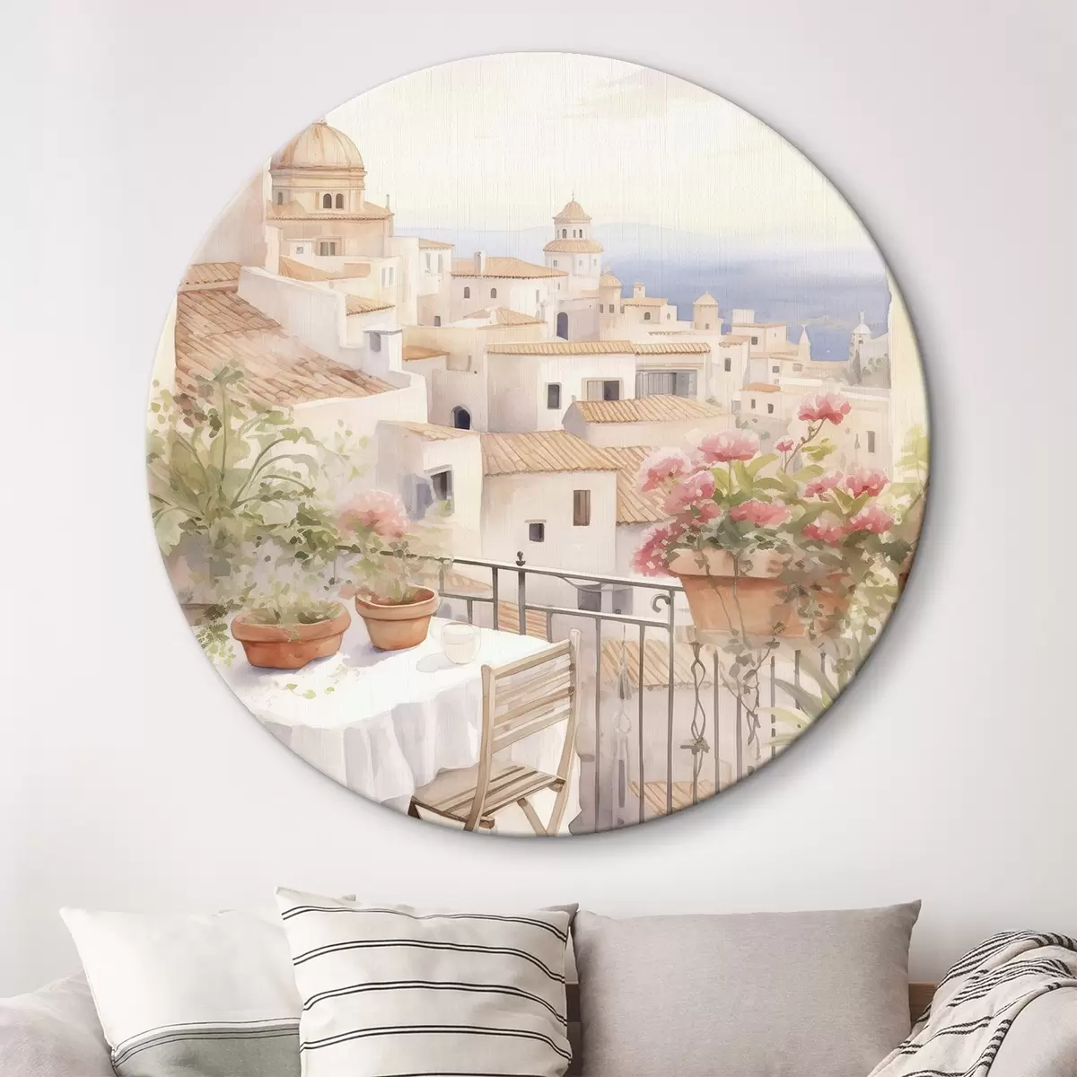 Ronde schilderijen Zonsondergang op het balkon, Italië, architectuur, bloeiende bloemen, aquarel stijl Nr r43184