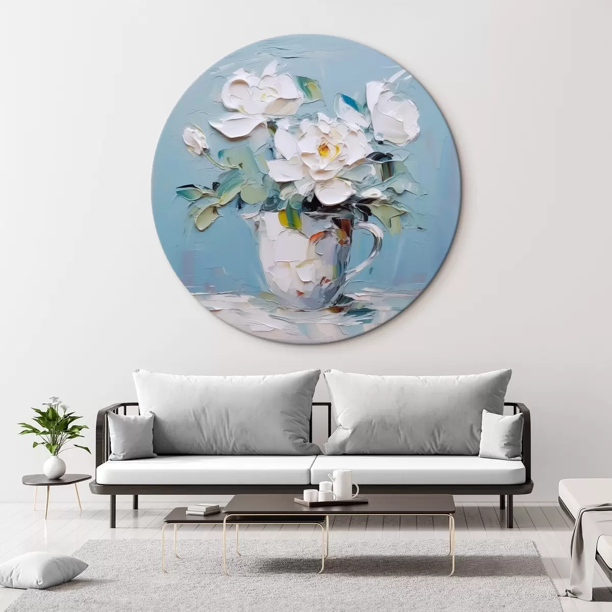 Ronde schilderijen Witte bloemen in een kop imitatieschilderij Nr r43225