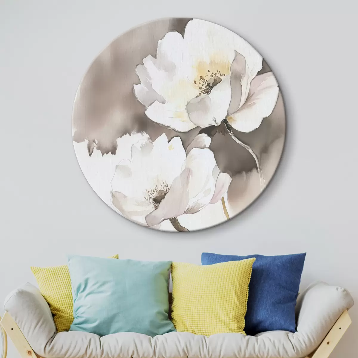 Ronde schilderijen Witte bloemen op een bruine achtergrond in de stijl van aquarelverf r43297