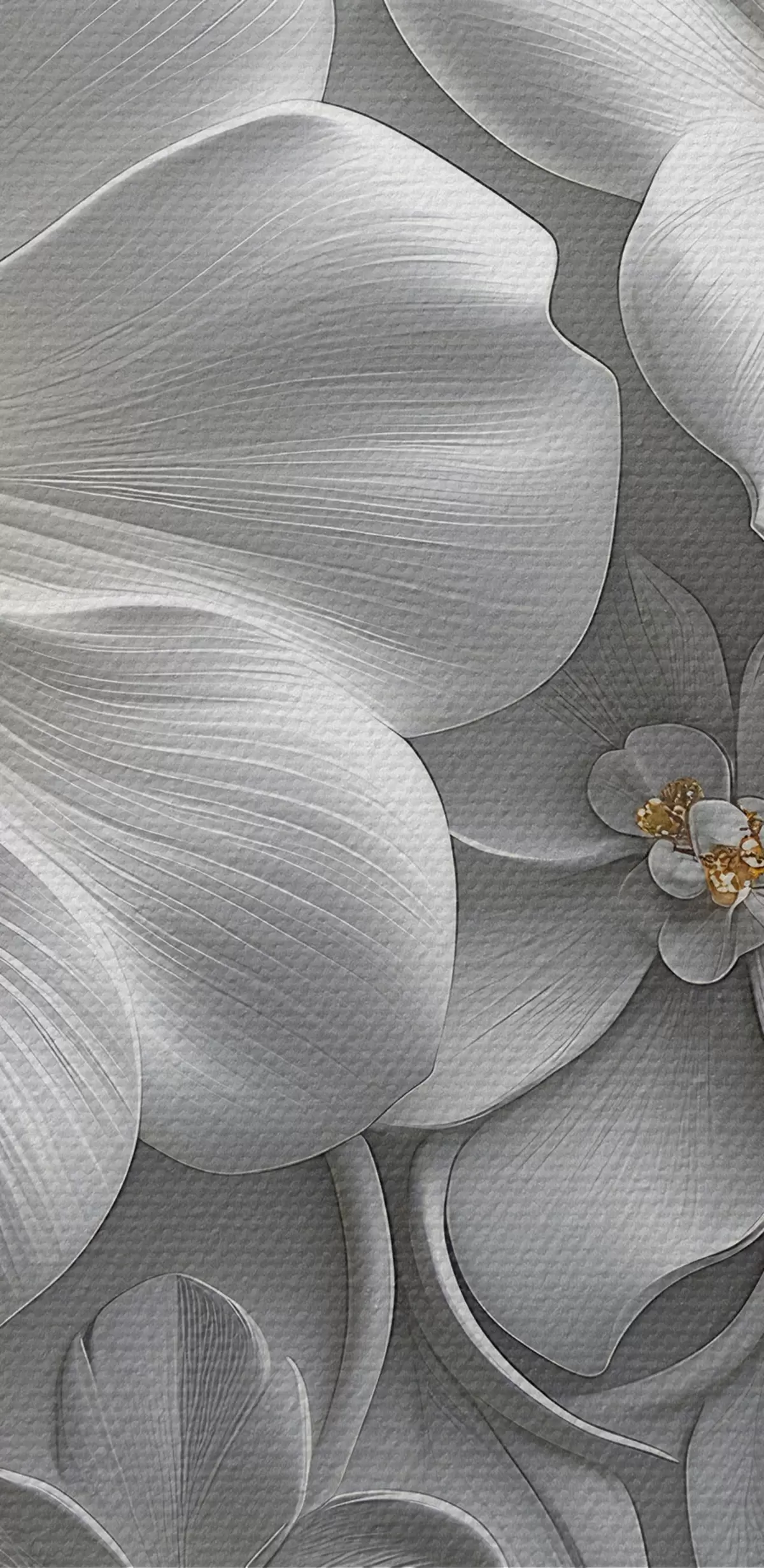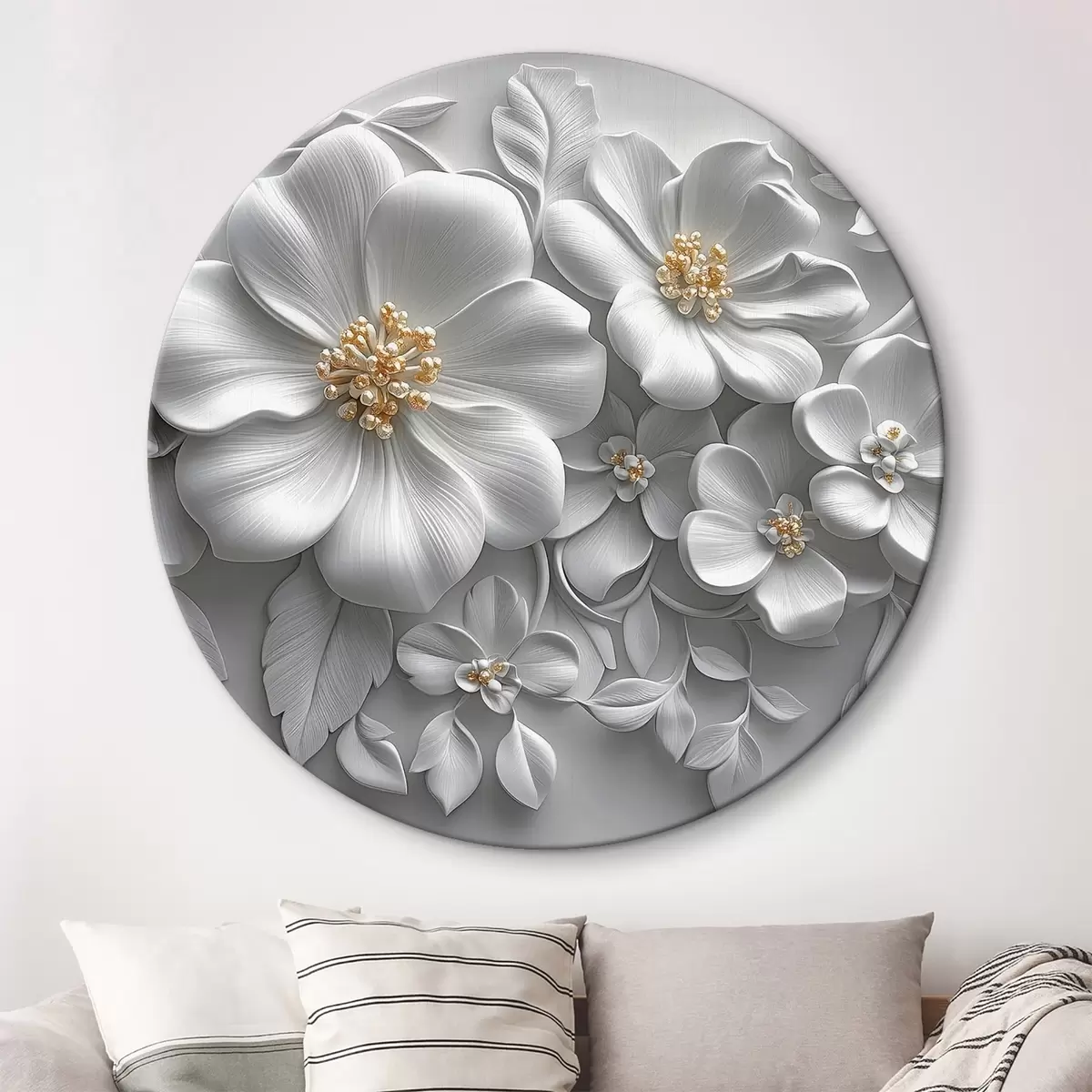 Ronde schilderijen 3d grijze bloemen met een geel accent Nr r43310