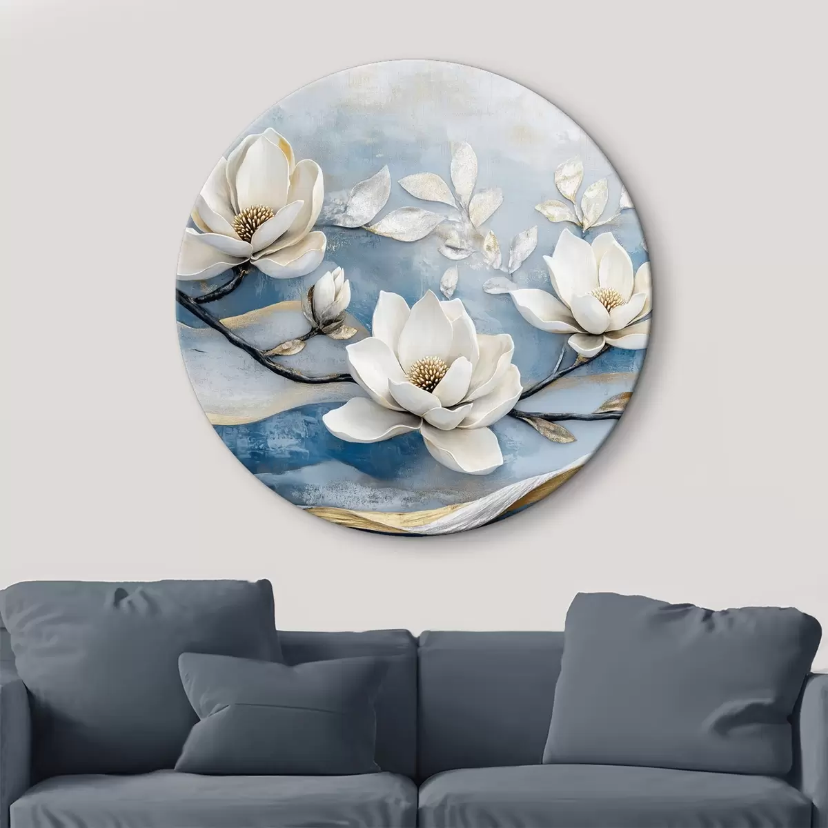 Ronde schilderijen Magnolia tak op een abstracte blauw-gele achtergrond Nr r43323