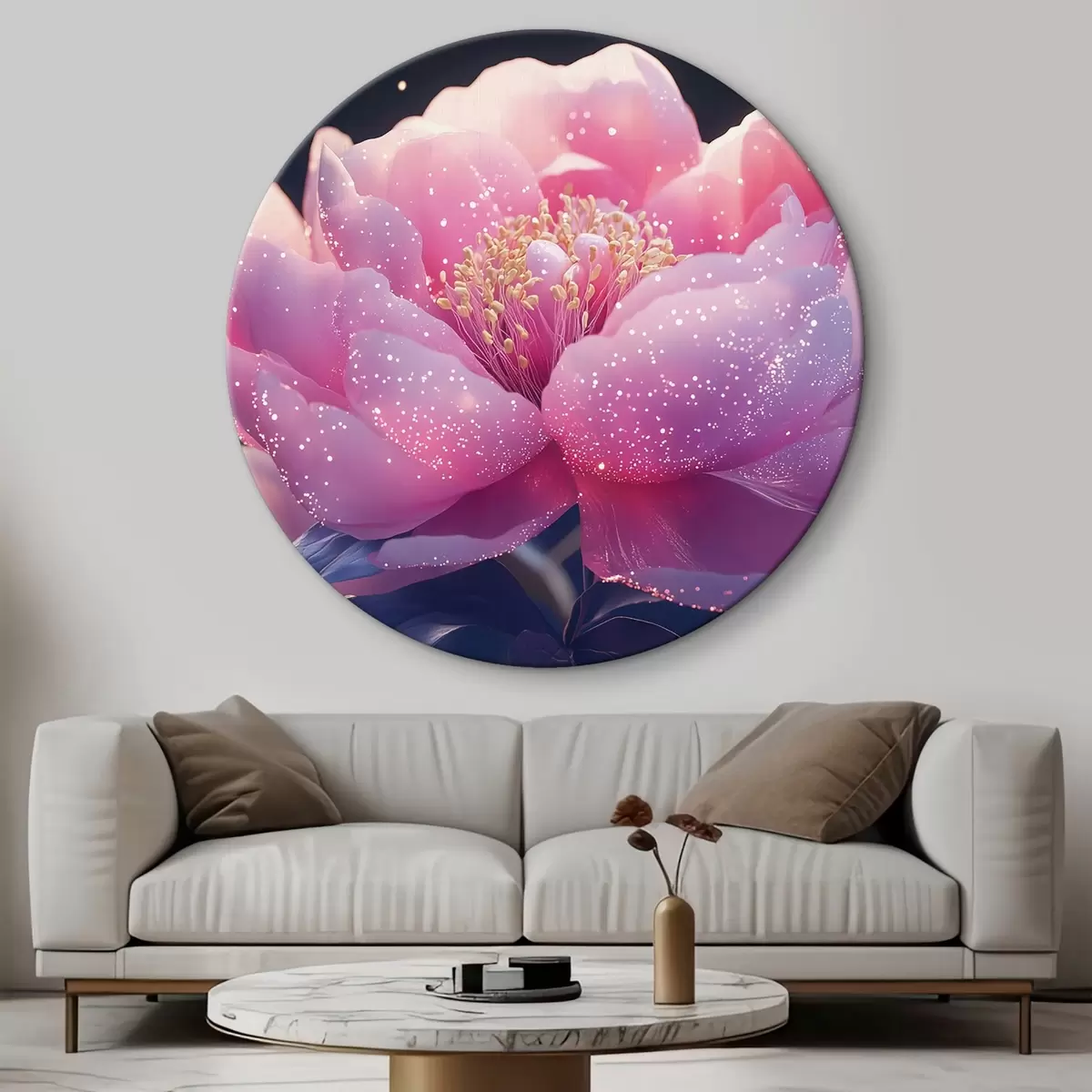 Ronde schilderijen Grote zachtroze bloem met zonnestralen Nr r43327