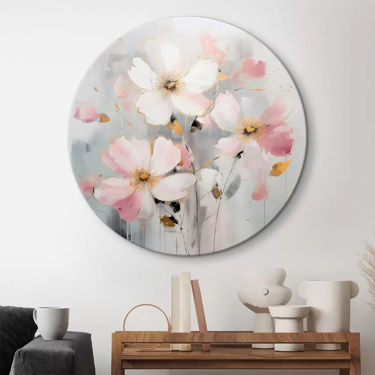 Ronde schilderijen Bloemen in zachte tinten met grote penseelstreken in schilderstijl r43380