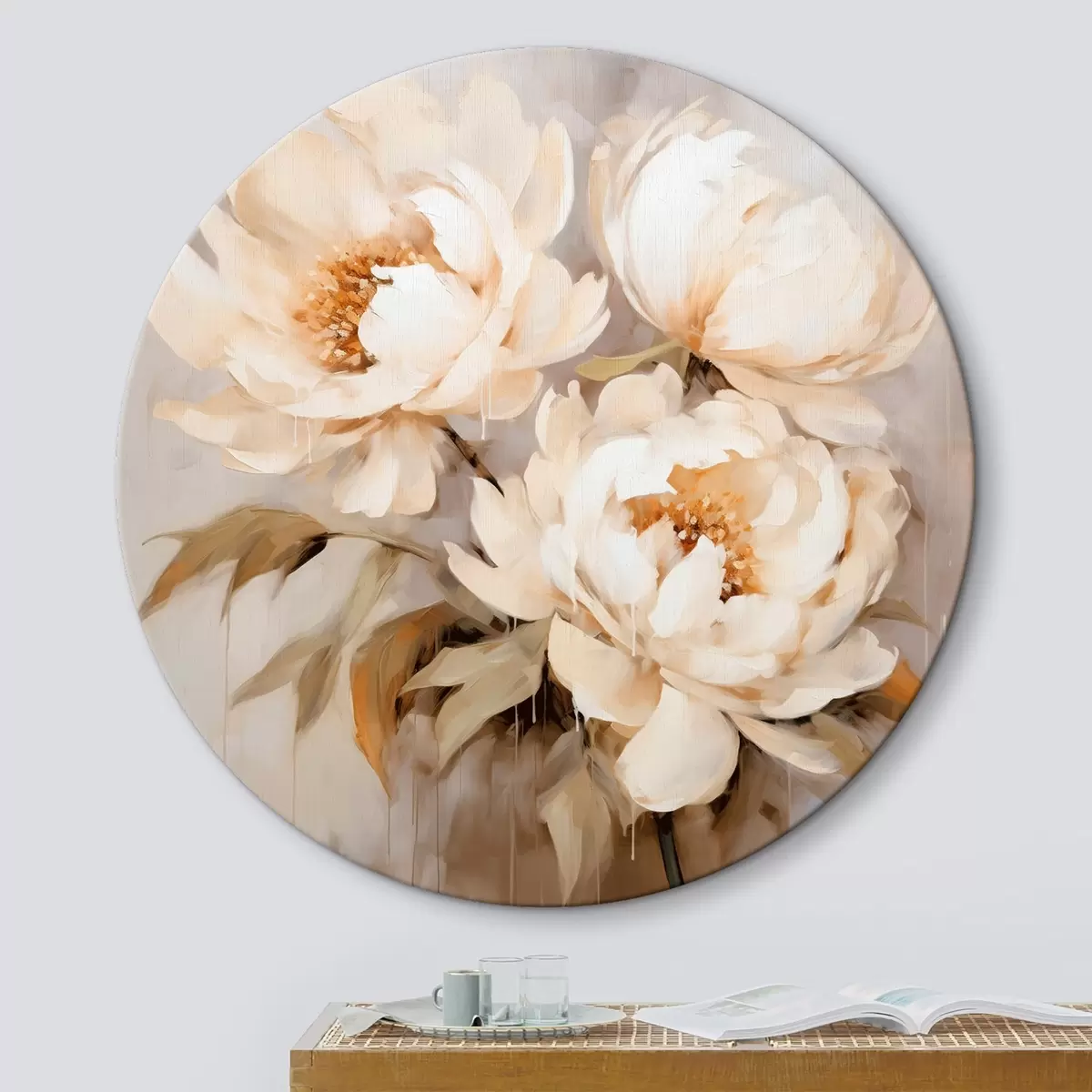 Ronde schilderijen Delicate pioenrozen in neutrale tinten in abstracte schilderstijl Nr r43387