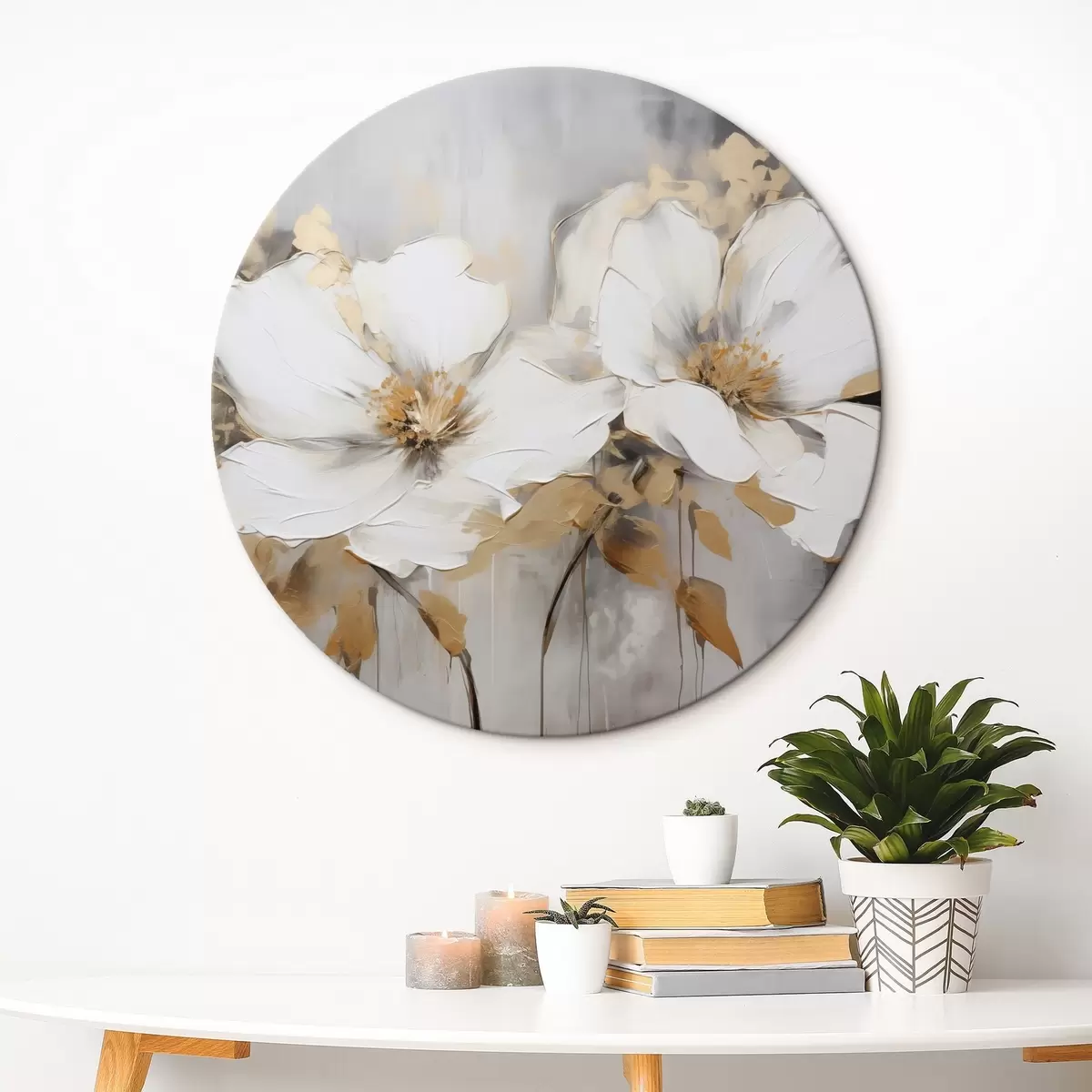Ronde schilderijen Witte bloemen met gele bladeren op een witte achtergrond, dikke penseelstreken imitatie, getextureerde moderne stijl r43389