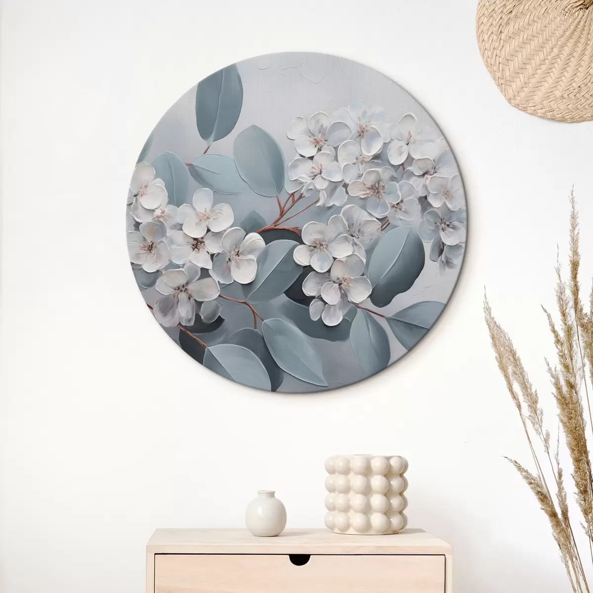 Ronde schilderijen Een tak witte hortensia bloemen in volle bloei, met blauwe bladeren op een lichtgrijze achtergrond, olieverfschilderij stijl Nr r43391