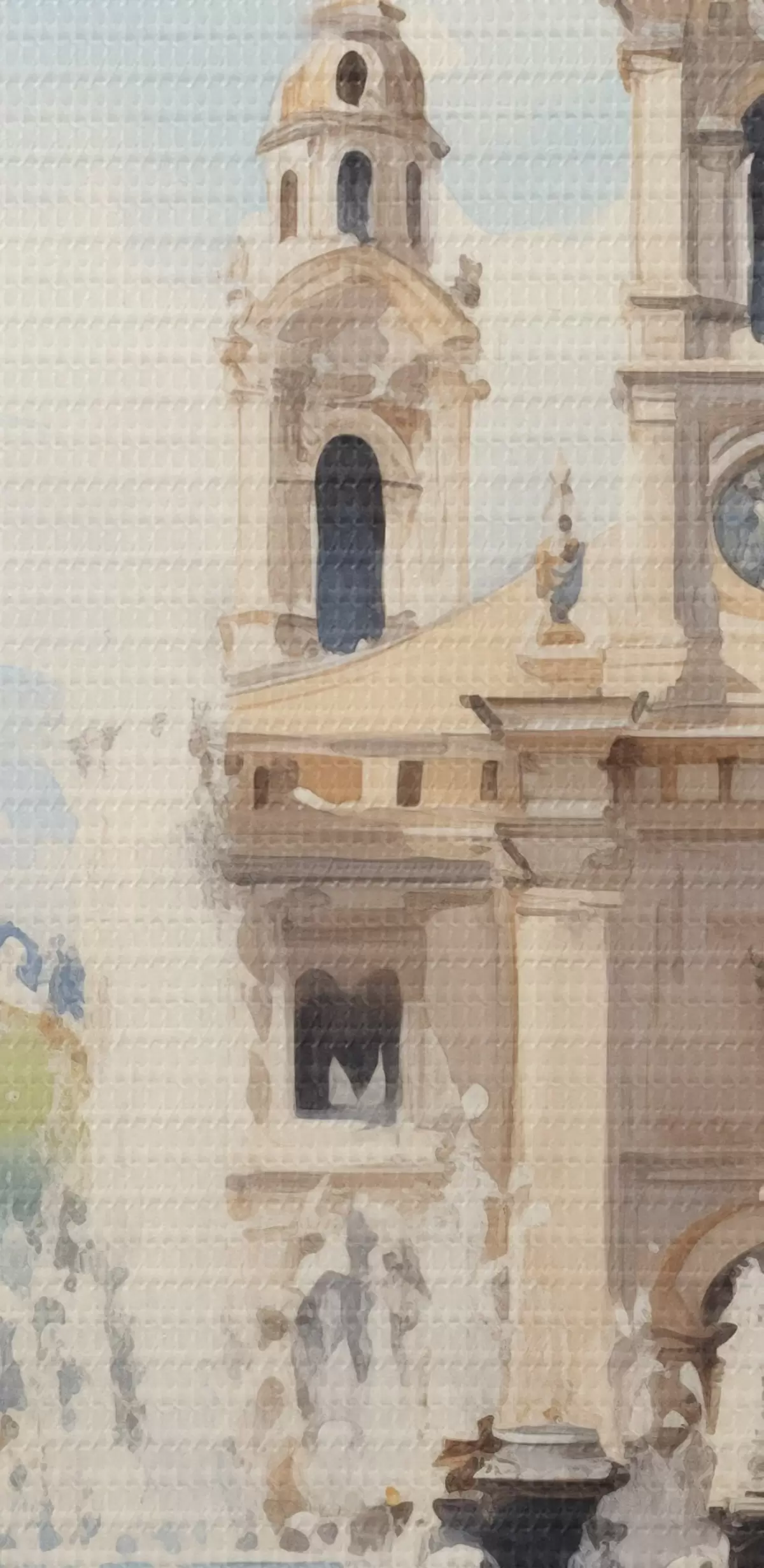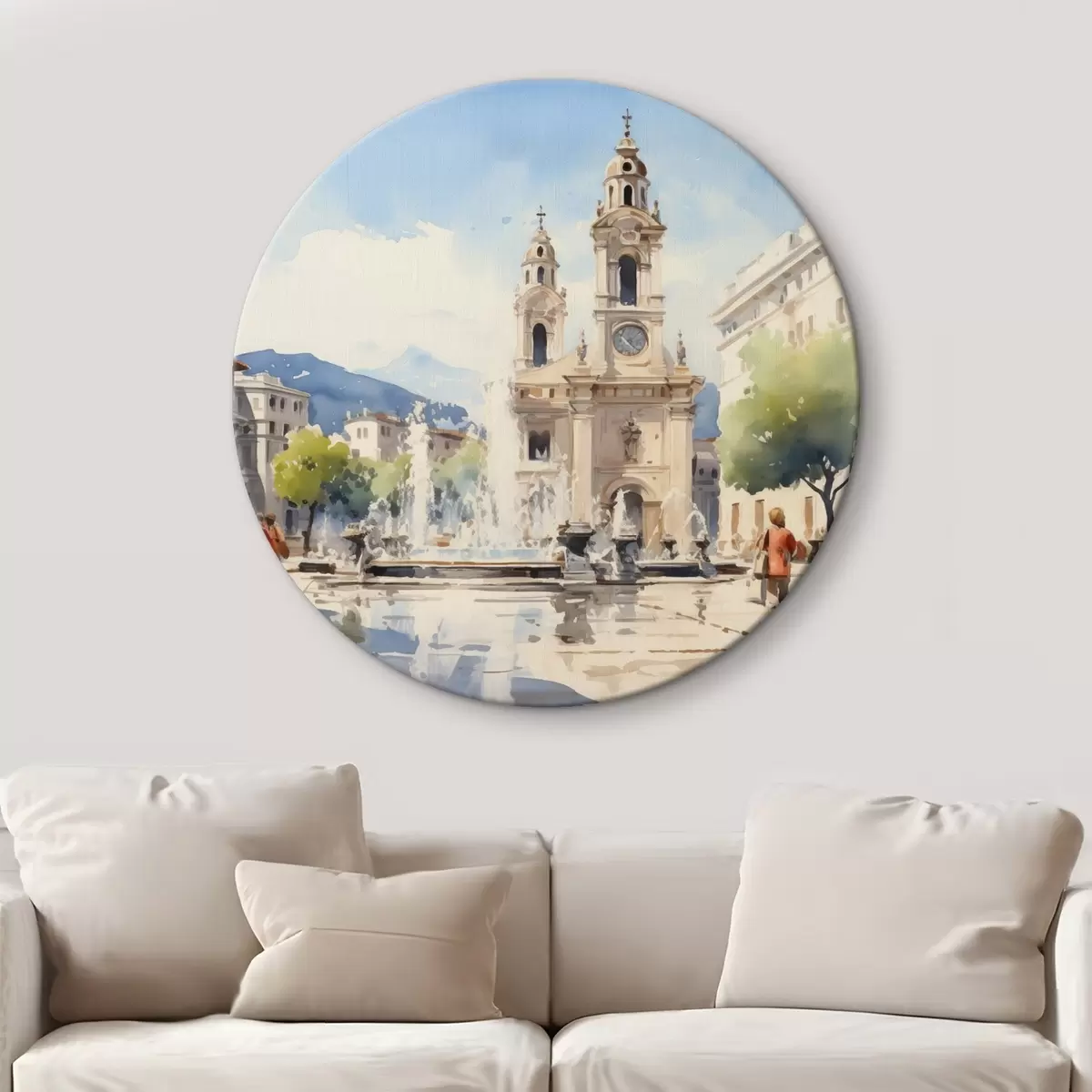 Ronde schilderijen Abstract stadsgezicht met toren en een fontein op een stadsplein, bergen in de verte, aquarelstijl Nr r43397