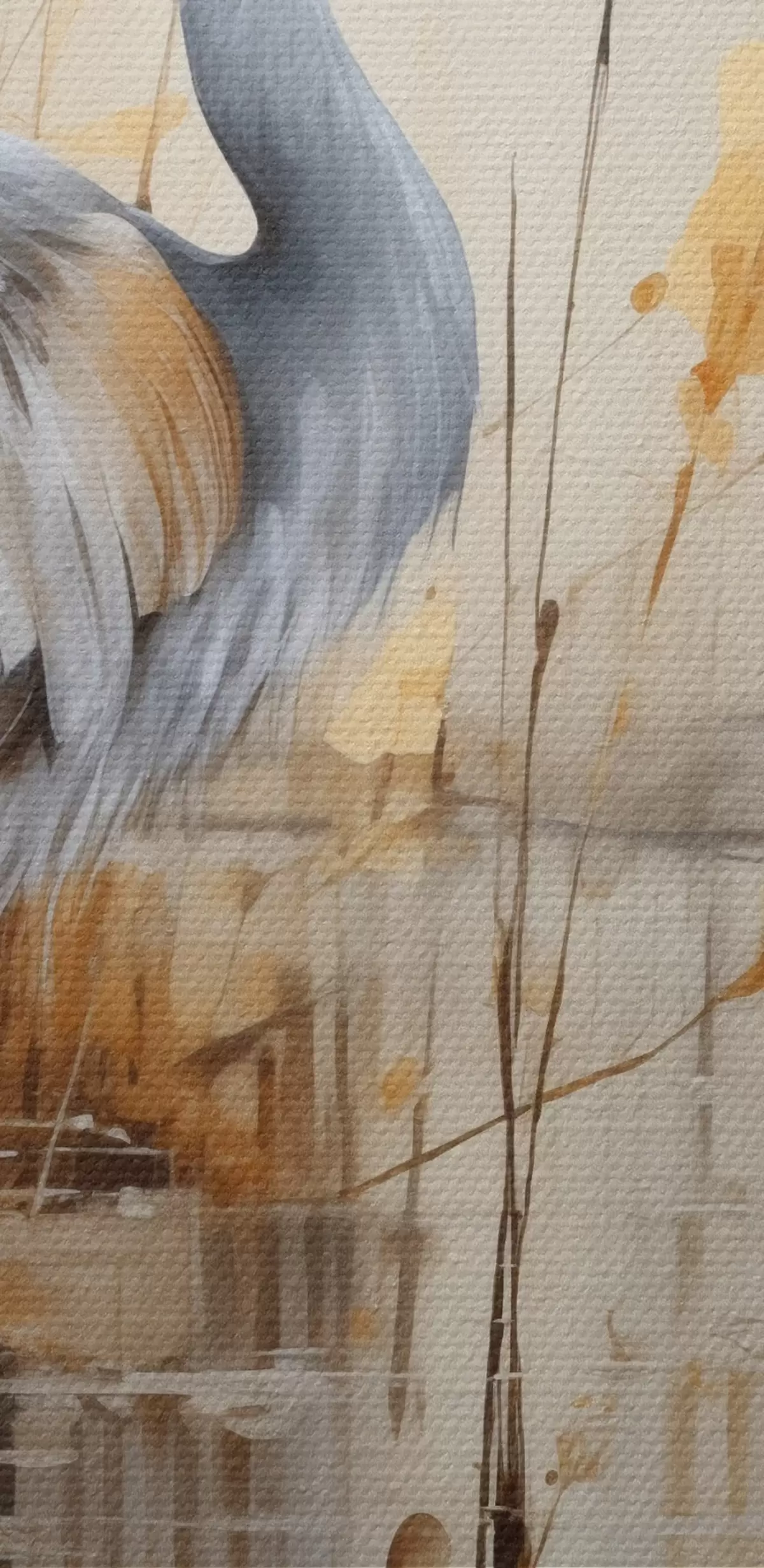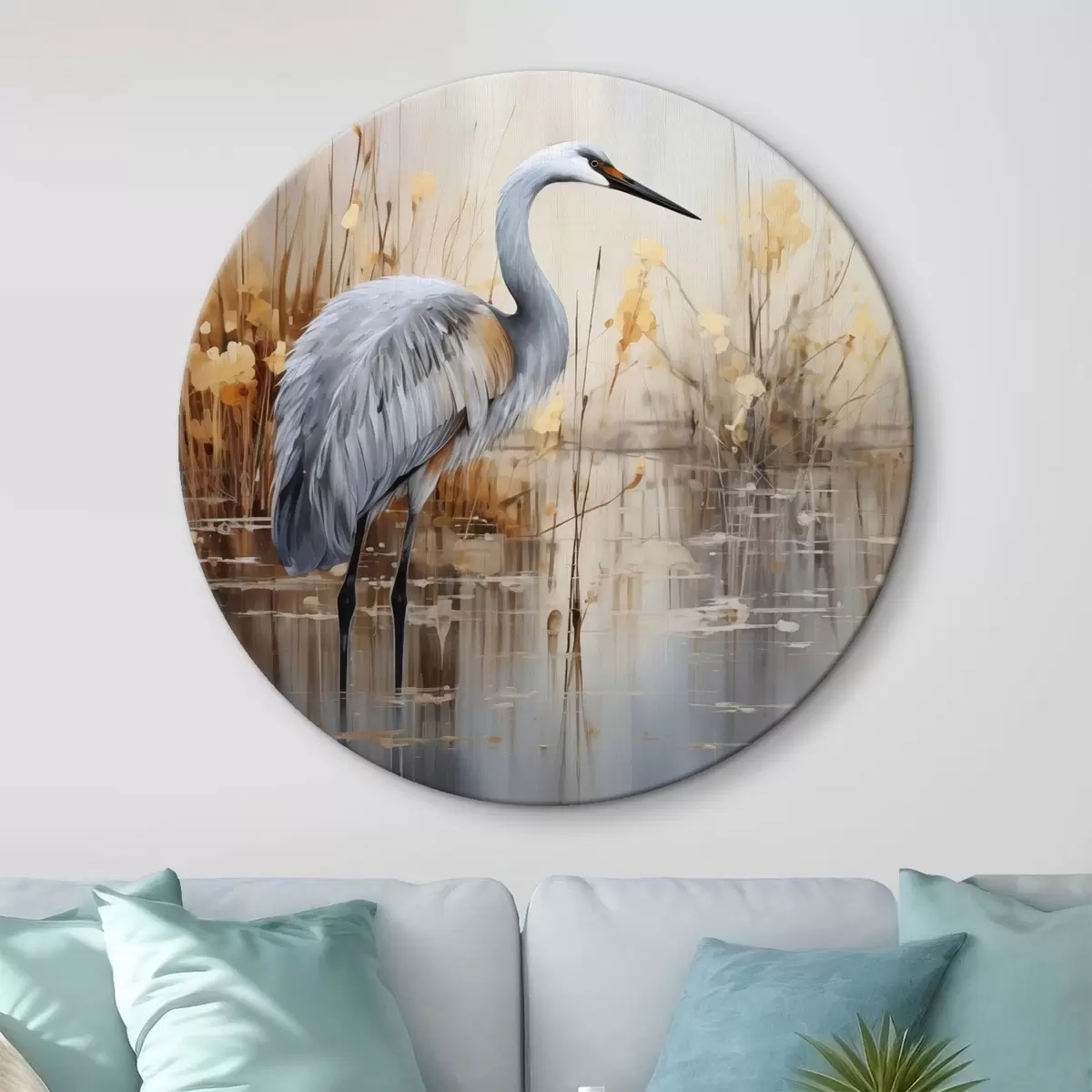 Ronde schilderijen Een grijze reiger in een vijver, omringd door hoge, dunne planten, de achtergrond is een zachte mix van beige en wit Nr r43398