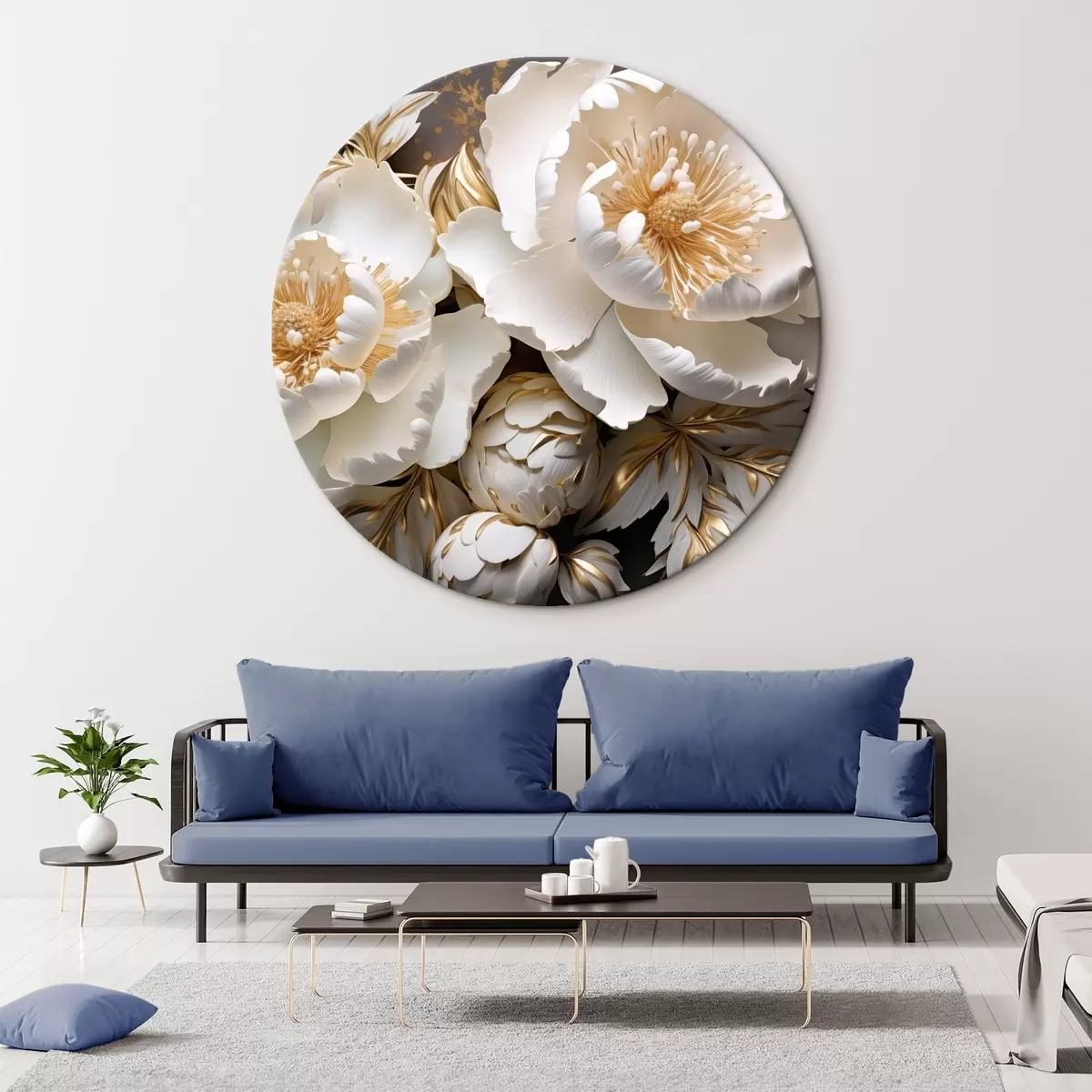 Ronde schilderijen Witte en gele pioenrozen met bladeren, ingewikkelde details, decoratieve kunst, donkere achtergrond Nr r43399