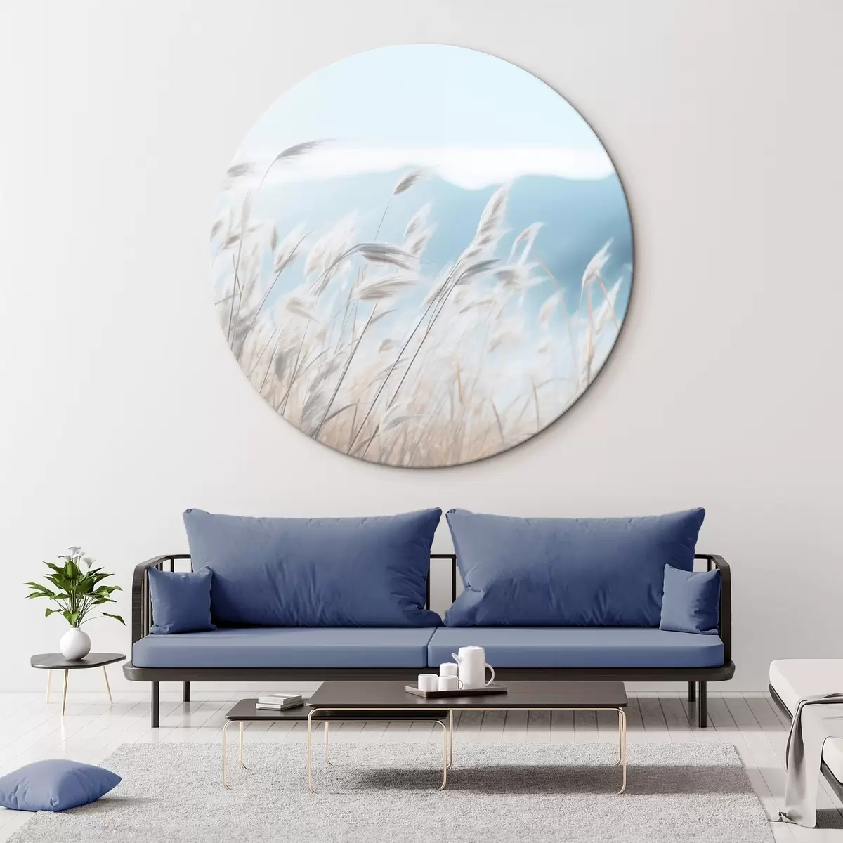 Ronde schilderijen Gras, pampaveld met een blauwe berg op de achtergrond, lichtblauwe lucht, minimalistisch, pastelkleuren Nr r43404
