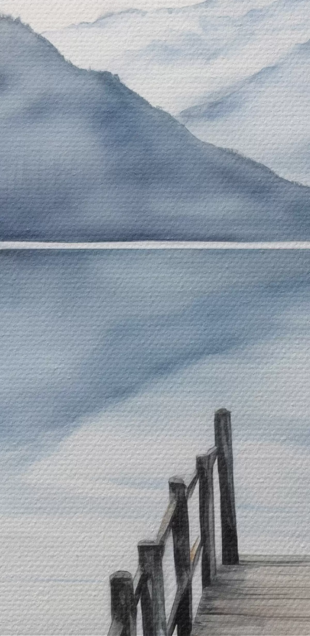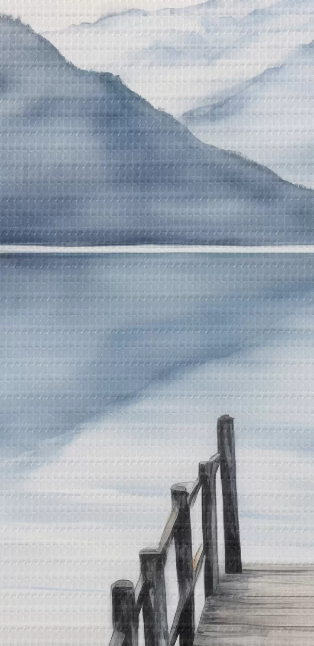 Ronde schilderijen Een houten steiger strekt zich uit in een kalm meer, omringd door bergen en altijd groene bomen, aquarelstijl Nr r43405