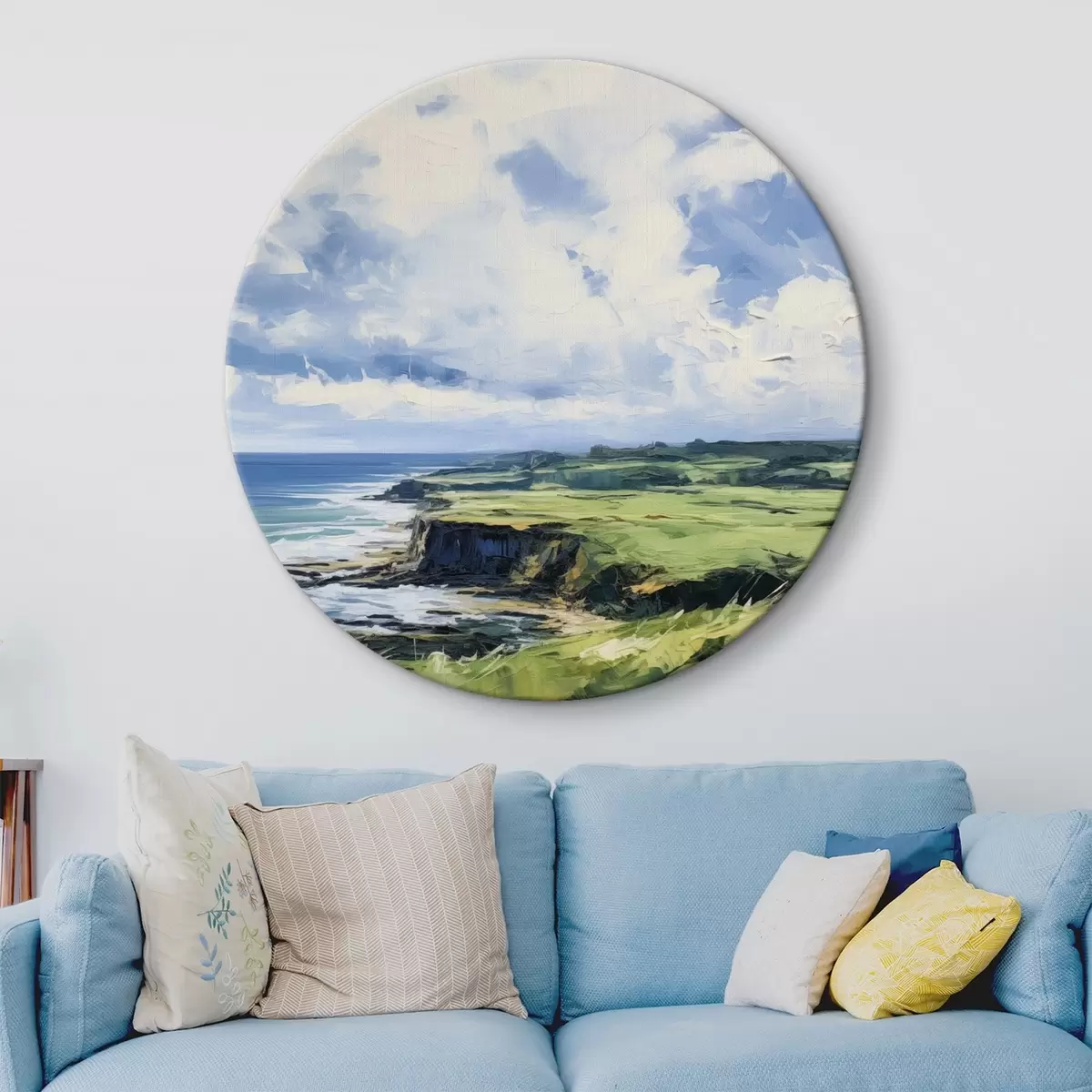 Ronde schilderijen Groen veld met een klif aan de kust, blauwe zee met golven, bewolkte lucht, minimalistisch modern olieverfschilderij imitatie r43406