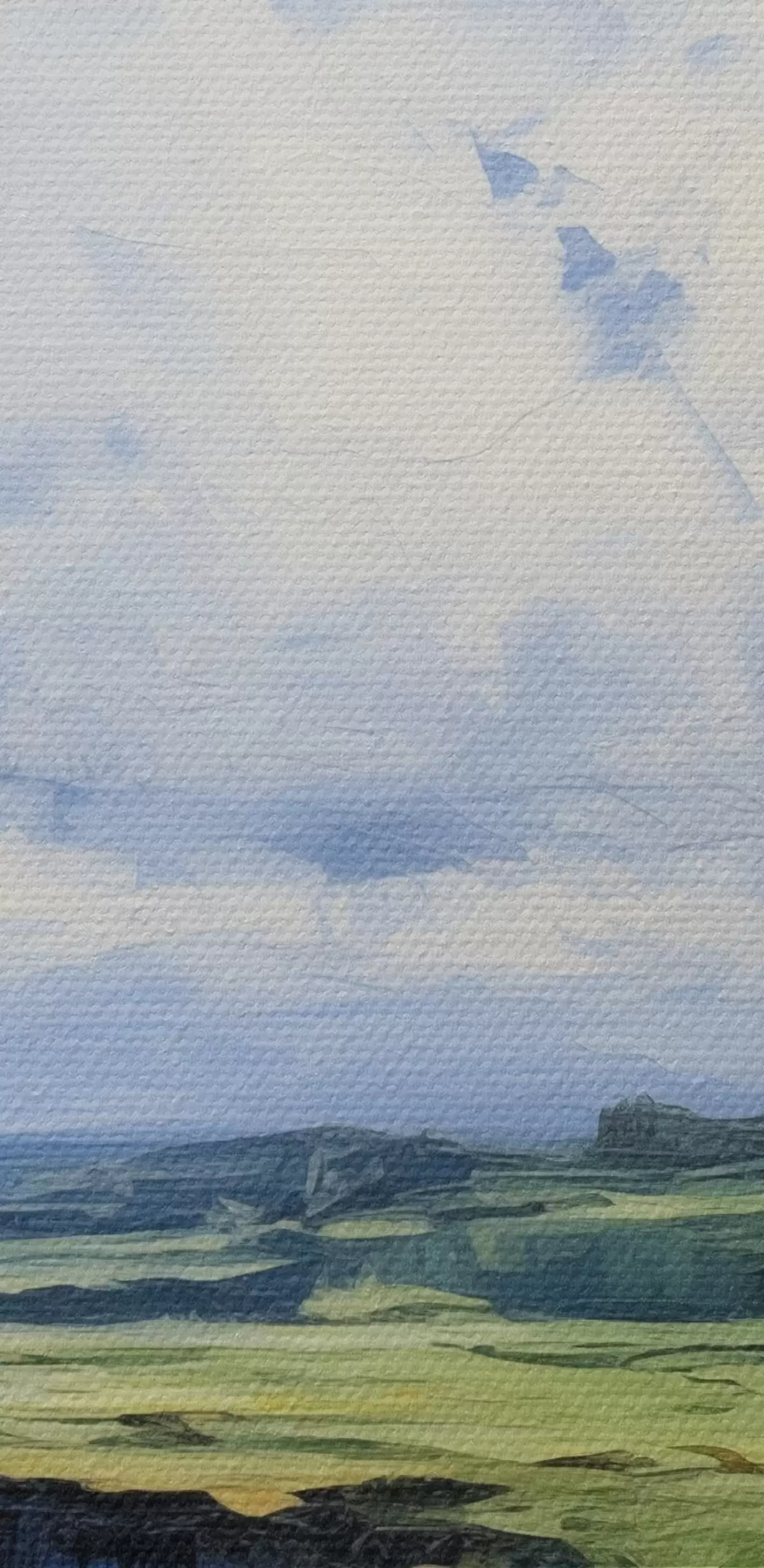 Ronde schilderijen Groen veld met een klif aan de kust, blauwe zee met golven, bewolkte lucht, minimalistisch modern olieverfschilderij imitatie Nr r43406