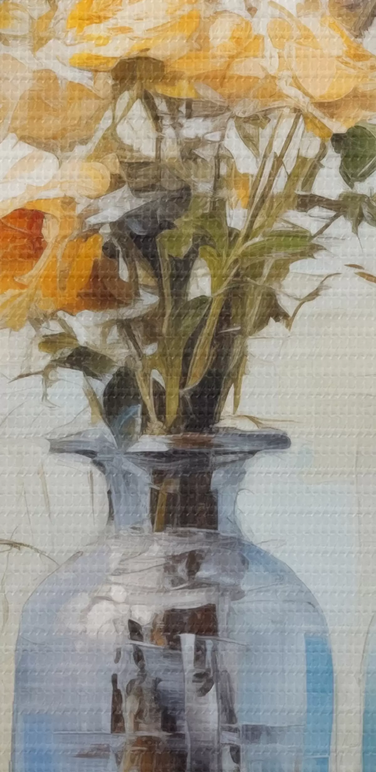 Ronde schilderijen Een stilleven van gele rozen in blauwe glazen vazen, licht gestructureerde achtergrond, zachte penseelstreken, stijl olieverfschilderij Nr r43409
