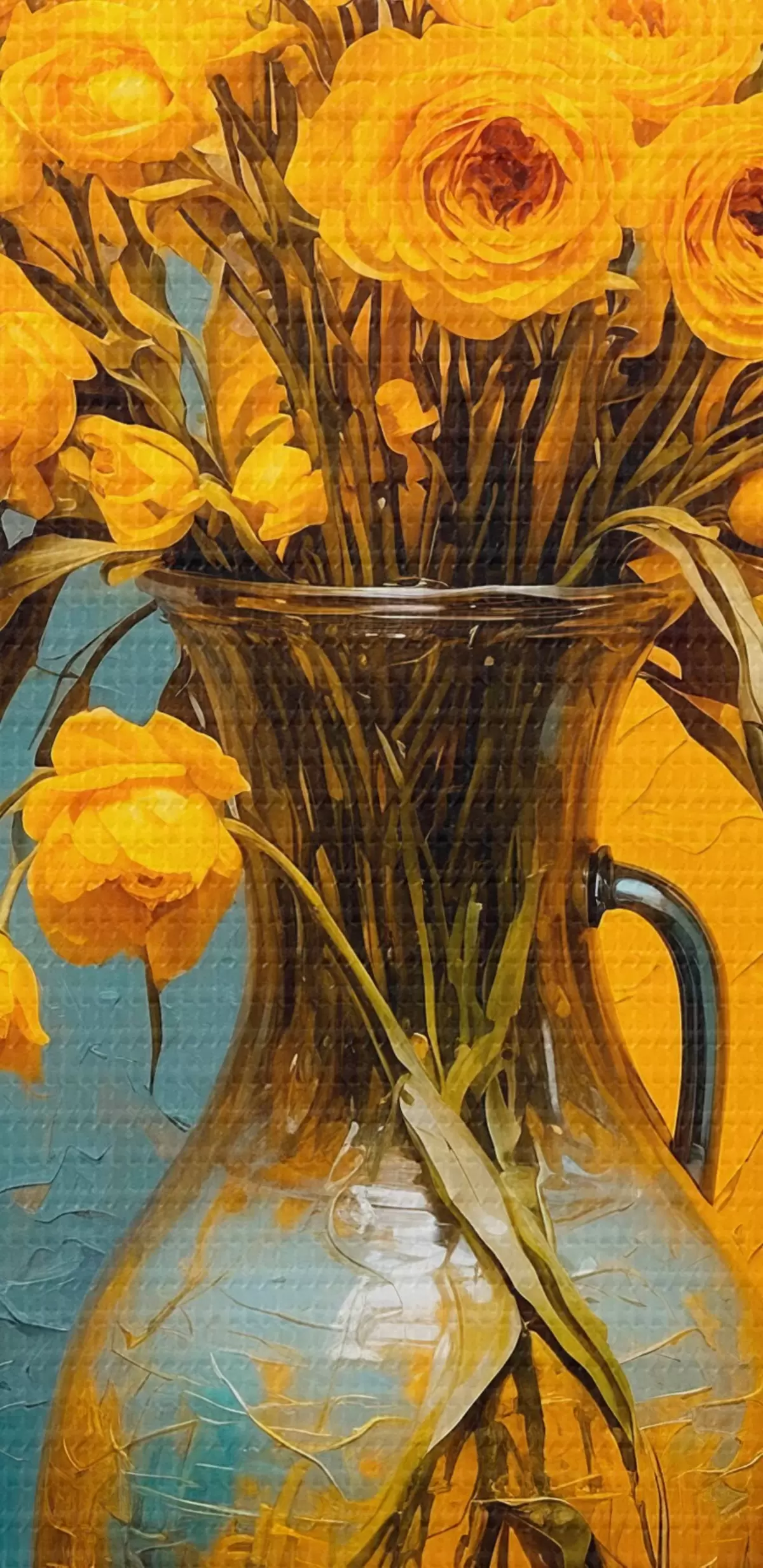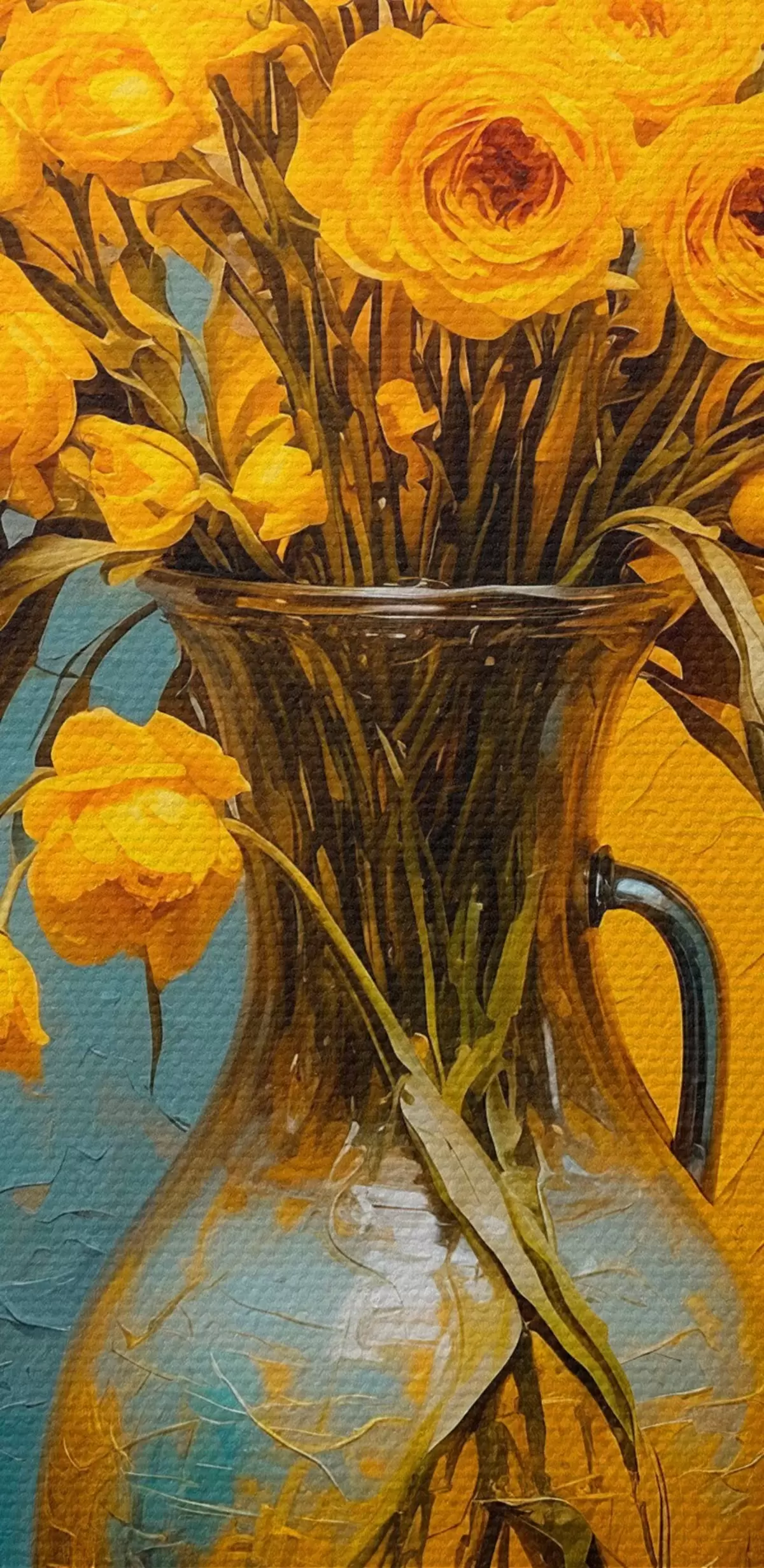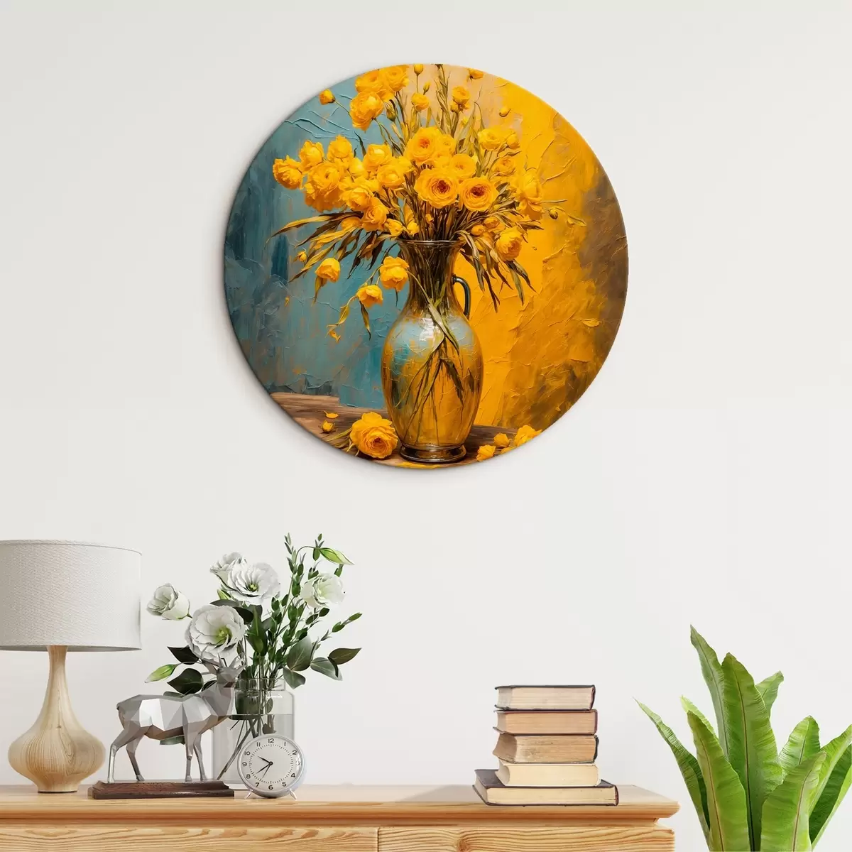 Ronde schilderijen Gele bloemen in een vaas op een tafel Nr r43462