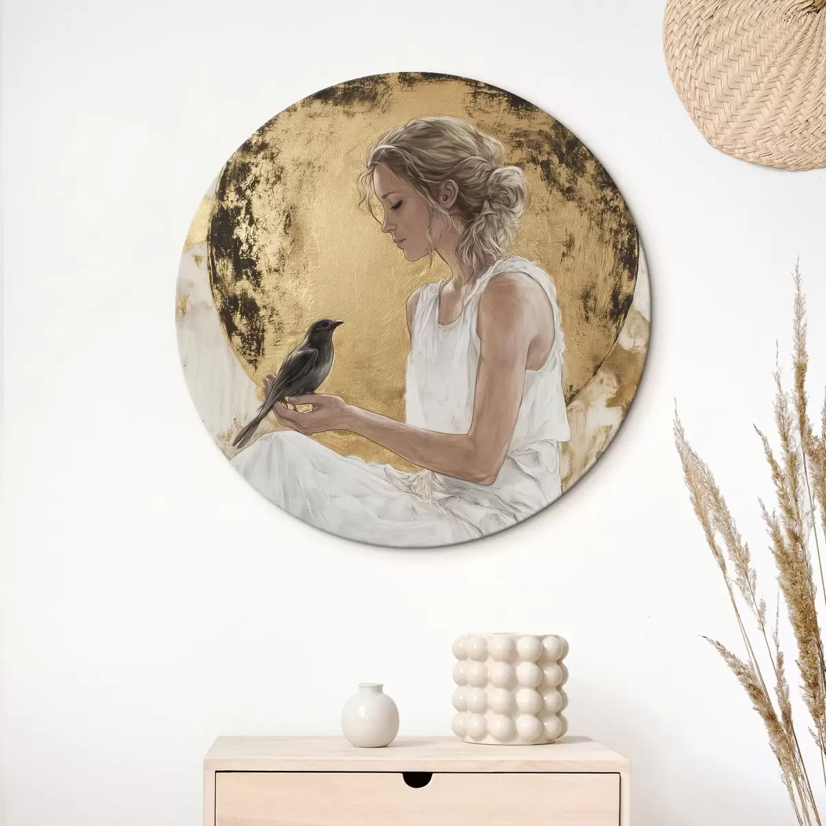 Ronde schilderijen Mooie vrouw met vogel, Griekenland, acrylstijl tekening r43503