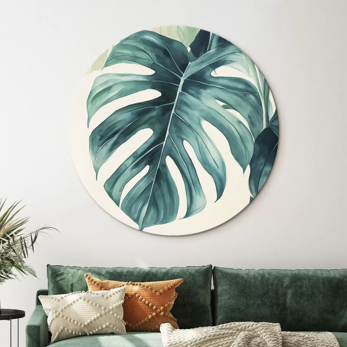Ronde schilderijen Monstera palmbladeren, aquarel stijl, bloemig, tropisch Nr r43507