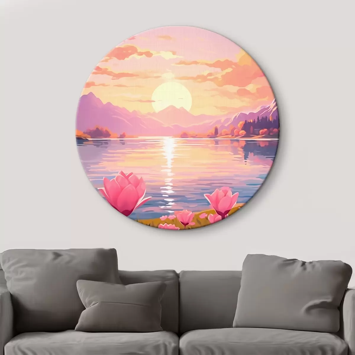 Ronde schilderijen Landschap met vijver op de achtergrond van bergen Nr r43523
