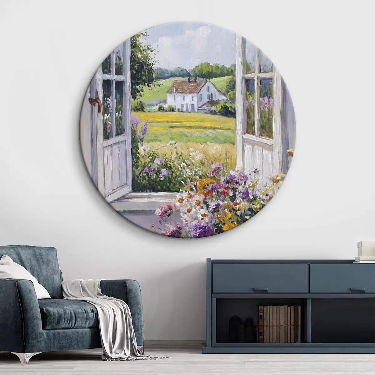 Ronde schilderijen Dorpslandschappen in het houten venster, bloemen, velden, olieverfstijl, boerderij r43888