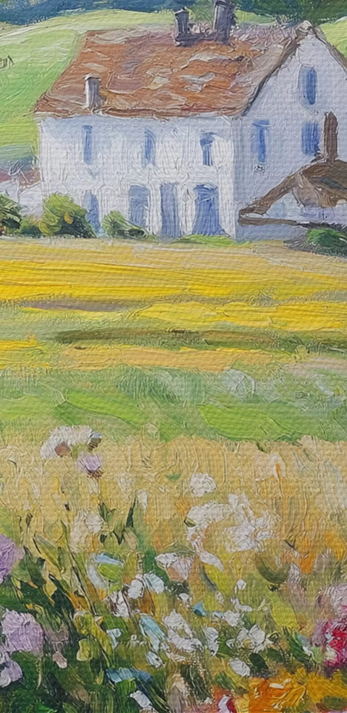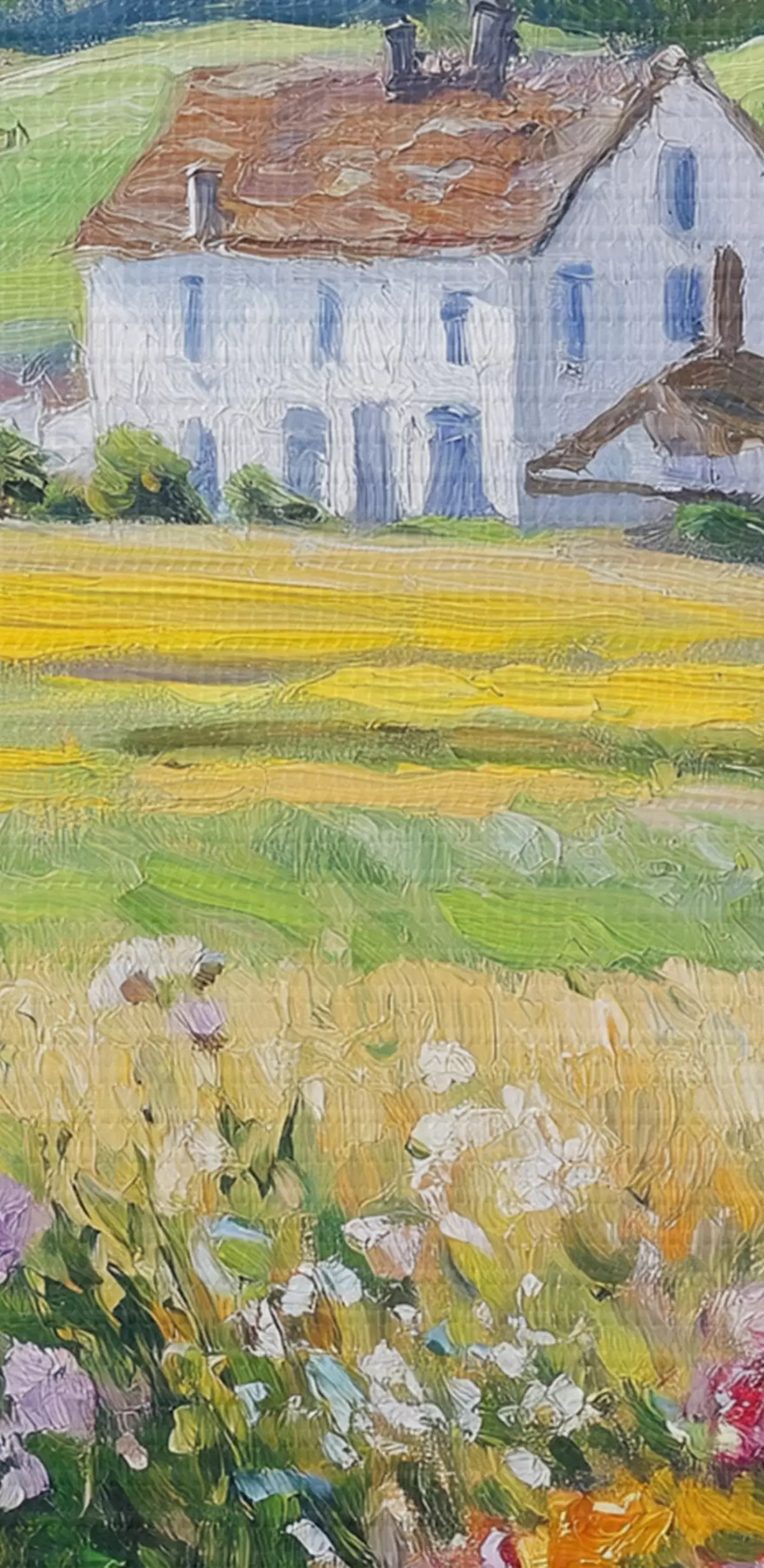 Ronde schilderijen Dorpslandschappen in het houten venster, bloemen, velden, olieverfstijl, boerderij Nr r43888