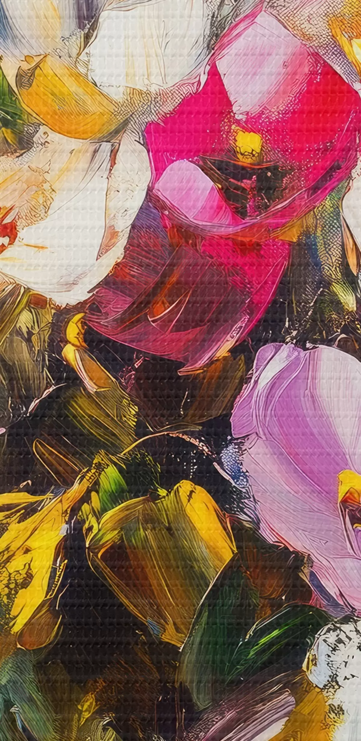 Er zijn drie soorten materiaal te bestellen: Economic Canvas - een dicht en duurzaam materiaal voor digitaal printen, identiek aan schildersdoek, waterdicht oppervlak, realistische weergave van details, materiaal met gemiddelde korrel. Premium Canvas - de textuur lijkt op die van schildersdoek (verweven kleine draden). Zachte, gedetailleerde reproductie van de afbeelding op een mat oppervlak. Eco-Premium - hoogwaardige 100% katoenen stof. Dankzij de natuurlijke katoenvezels is het materiaal duurzaam en slijtvast. Uitstekende kleurweergave en detail.