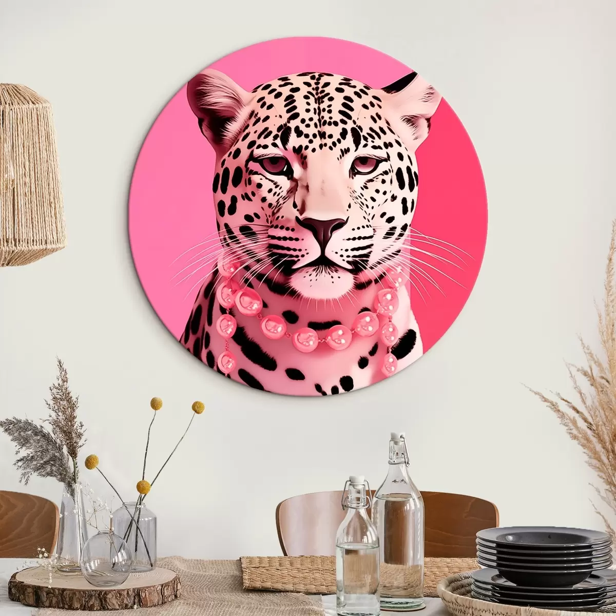 Ronde schilderijen Portret van een luipaard met roze ketting Nr r43976
