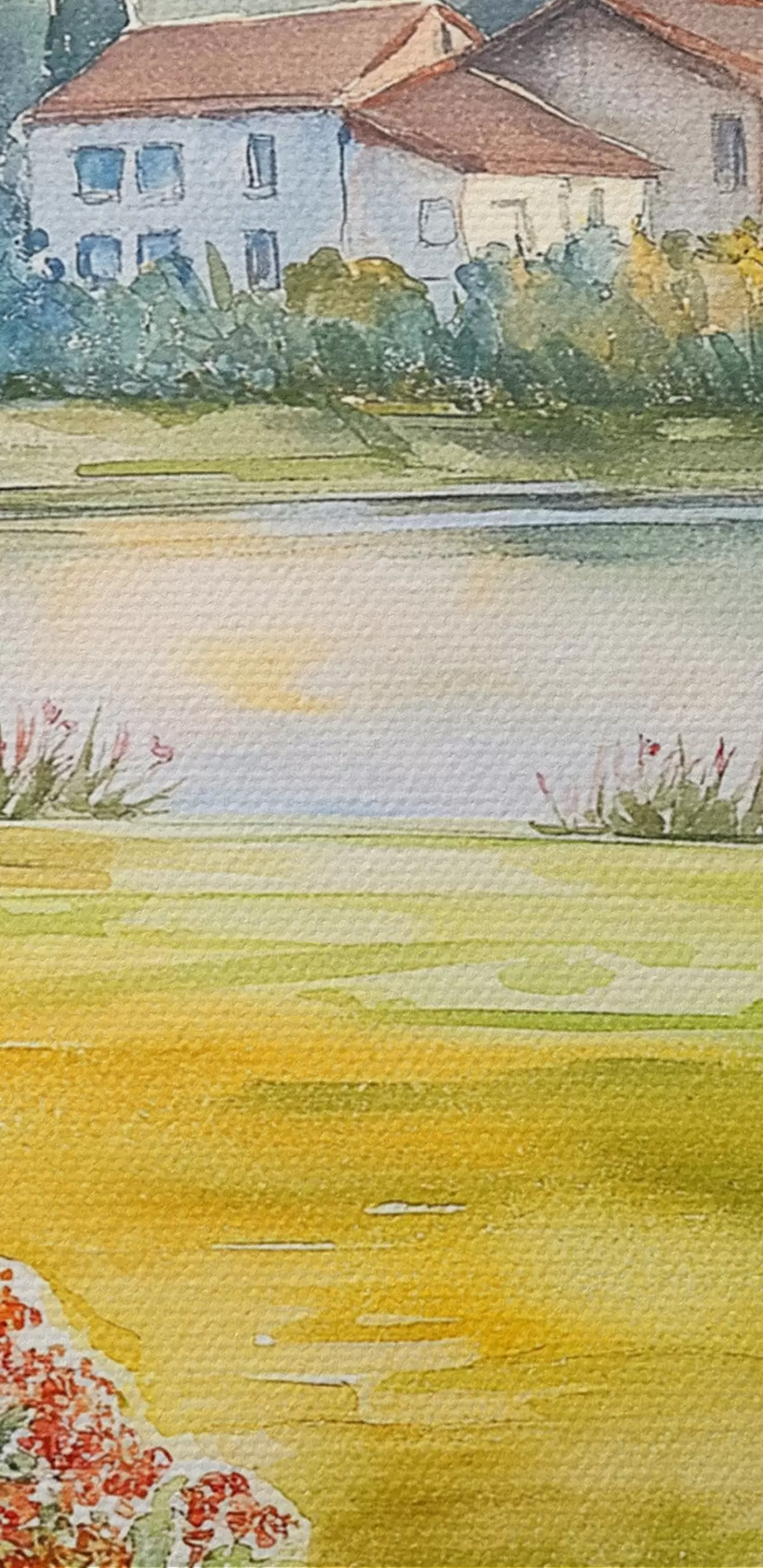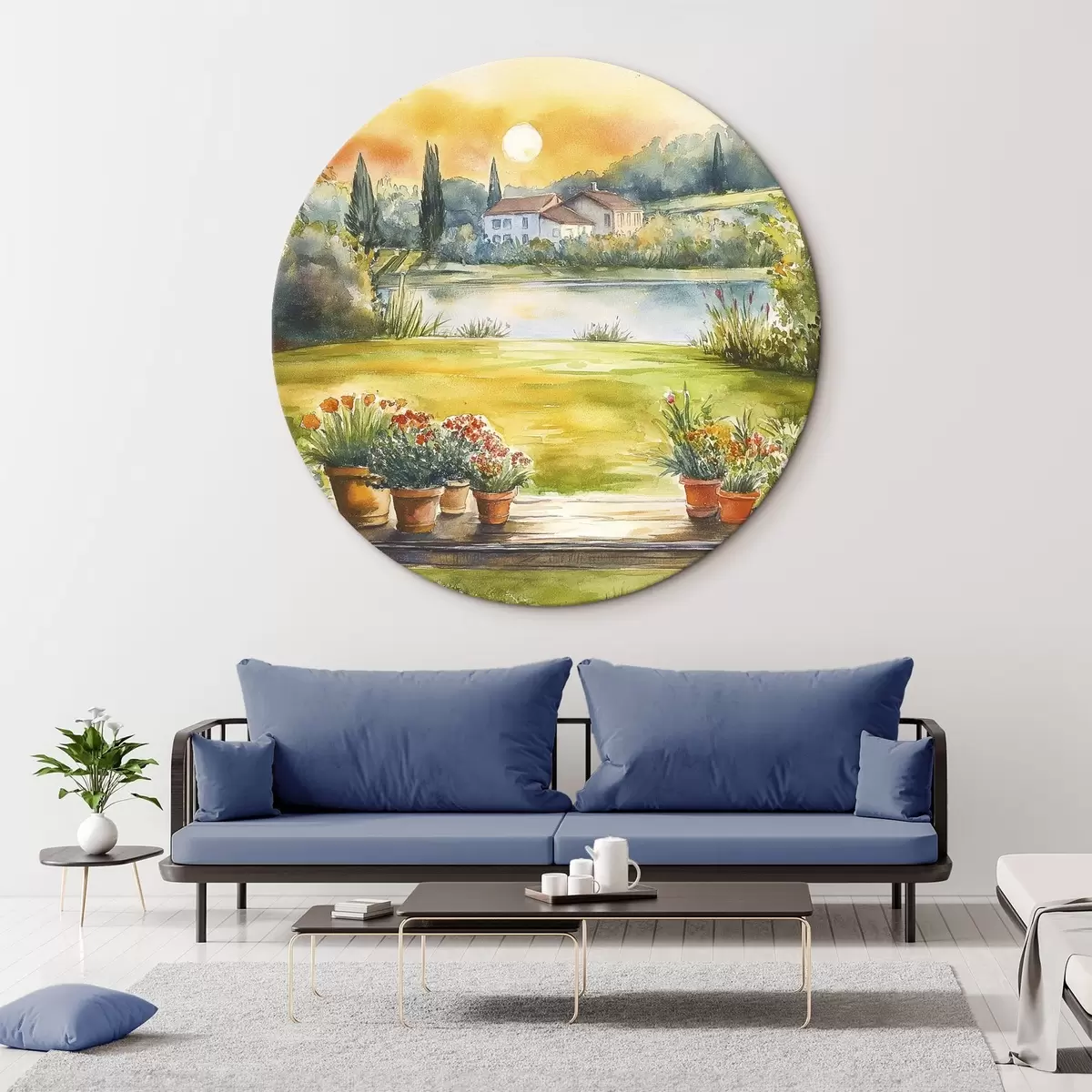 Ronde schilderijen Dorp op de zonsondergang, rustiek, zomer bloemen, meer, aquarel stijl Nr r44016