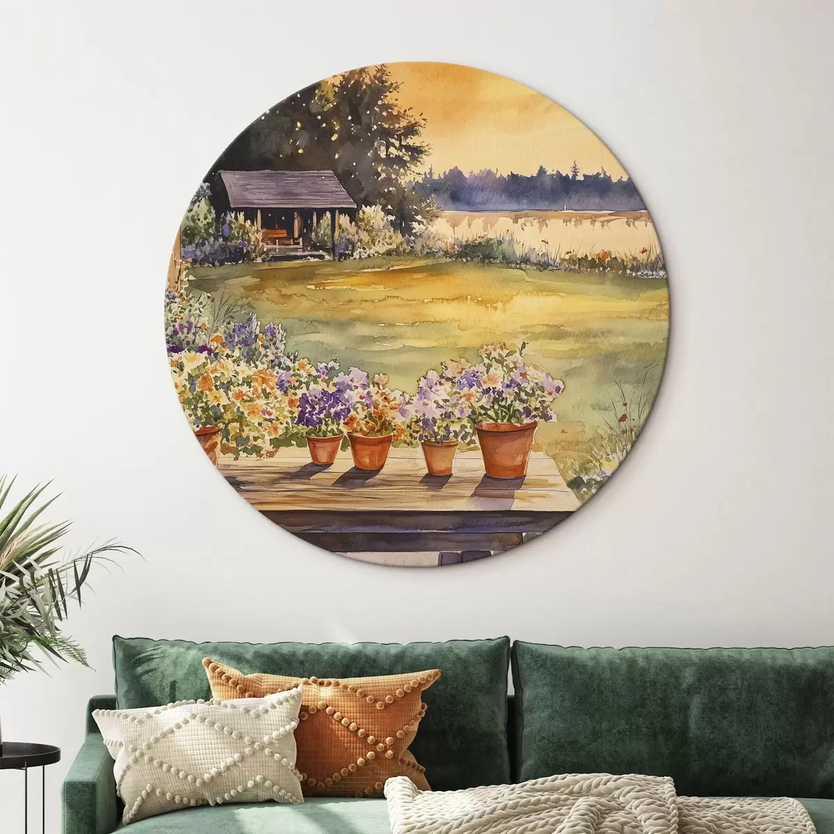 Ronde schilderijen Bloemen in de dorpstuin, kleuren van zonsondergang, aquarelstijl r44019