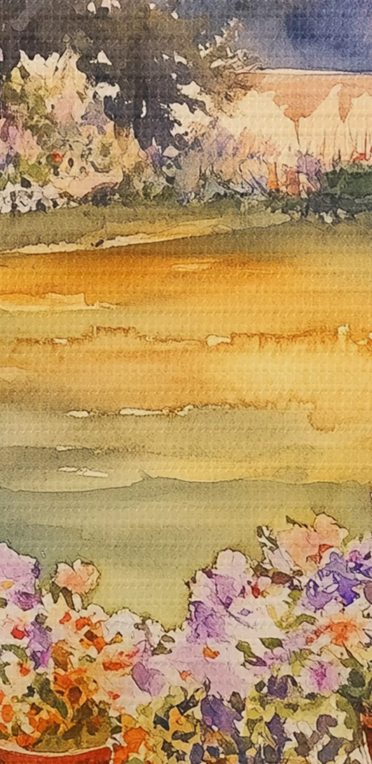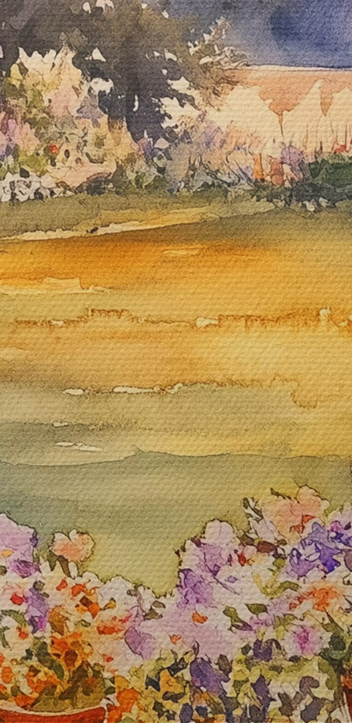 Ronde schilderijen Bloemen in de dorpstuin, kleuren van zonsondergang, aquarelstijl Nr r44019