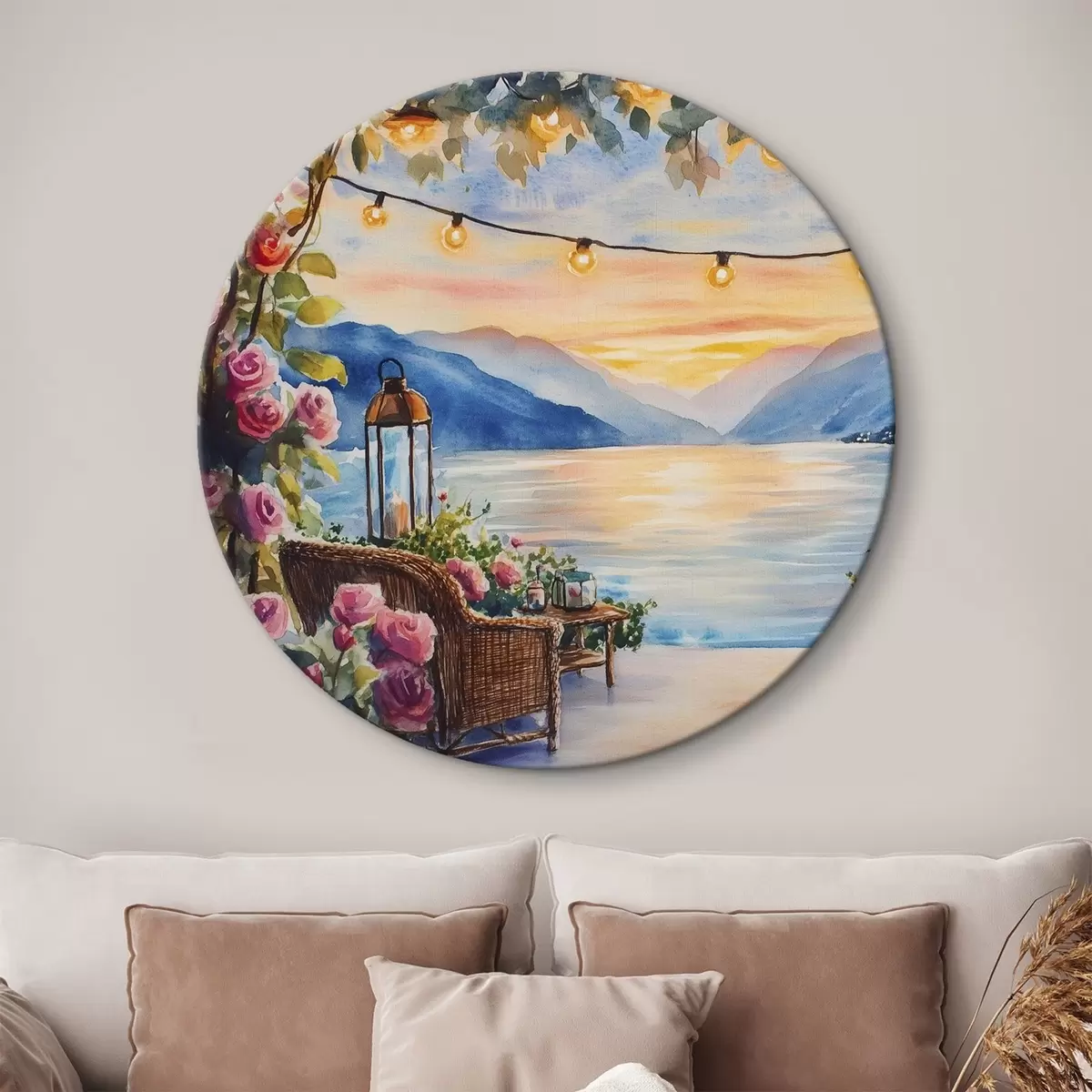 Ronde schilderijen Prachtige zonsondergang in de bergen, meer, rozen, boho stijl Nr r44025