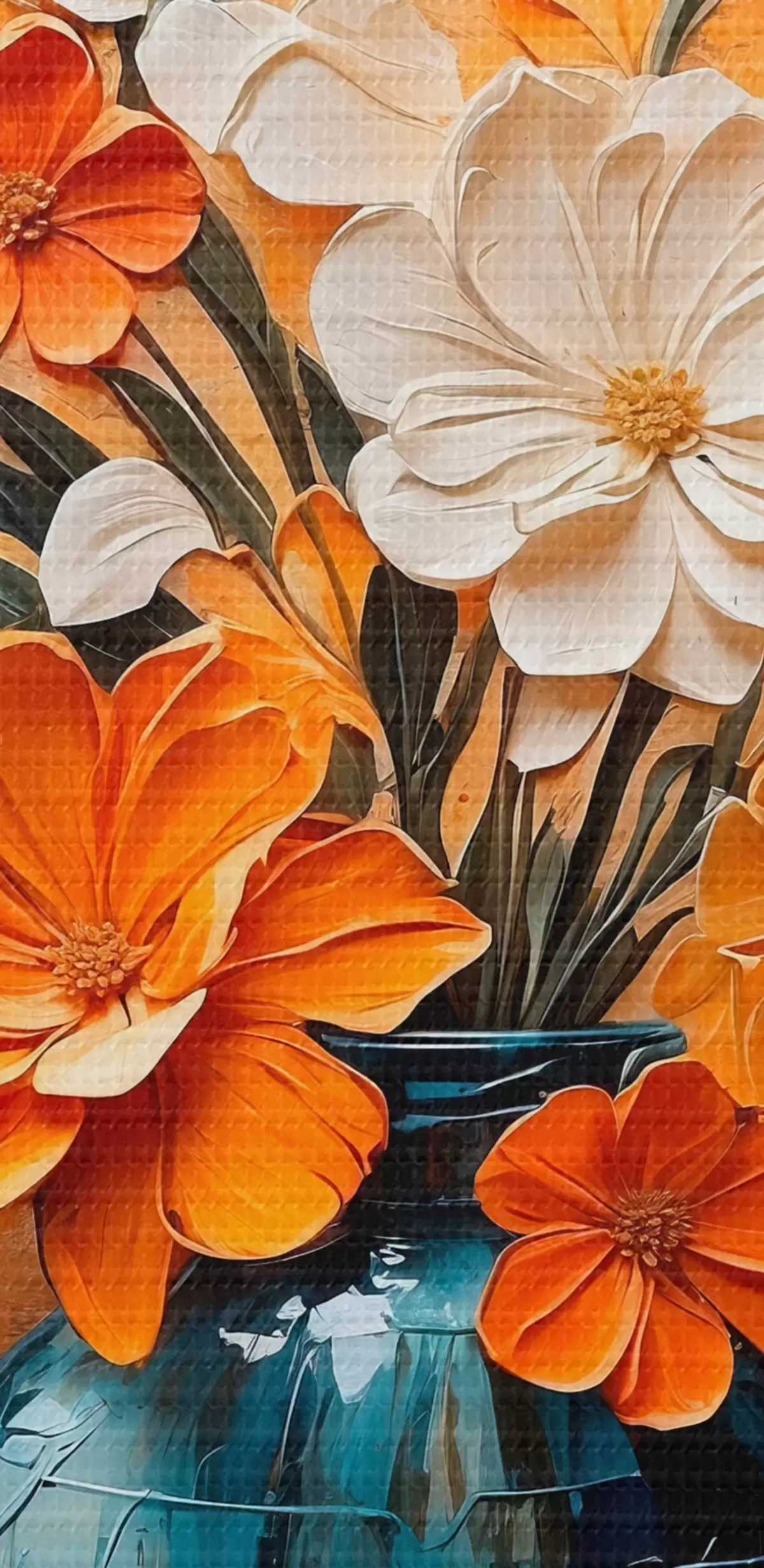 Ronde schilderijen Witte en oranje bloemen in vaas in olieverfschilderijstijl Nr r44059