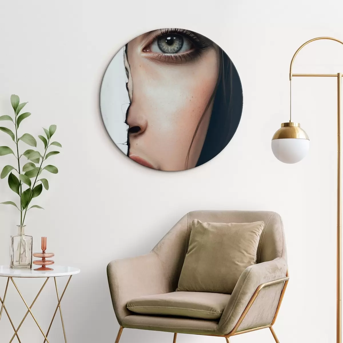 Ronde schilderijen Meisjesgezicht achter witte muur Nr r44083