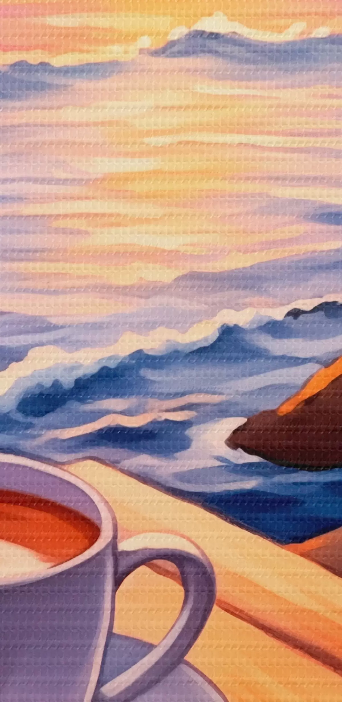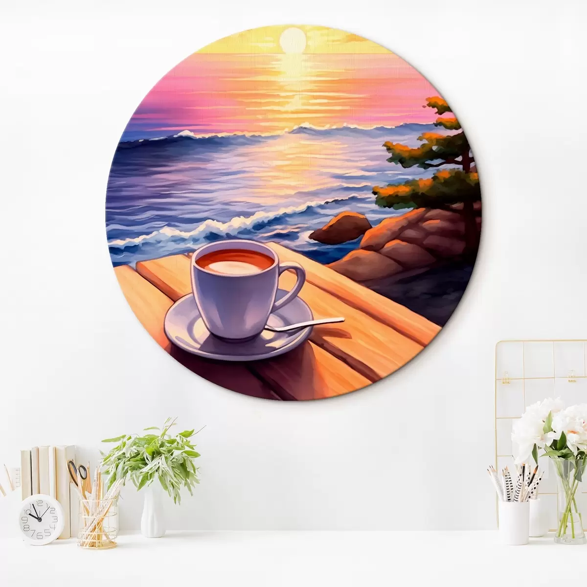 Ronde schilderijen Kopje koffie op de achtergrond van het landschap Nr r44105