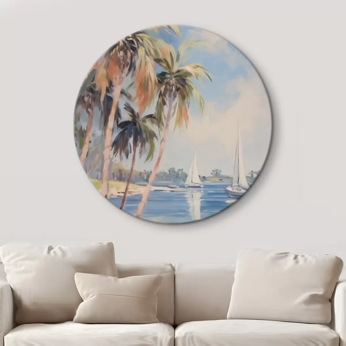 Ronde schilderijen Palmbomen aan de baai imitatie van schilderij r44122
