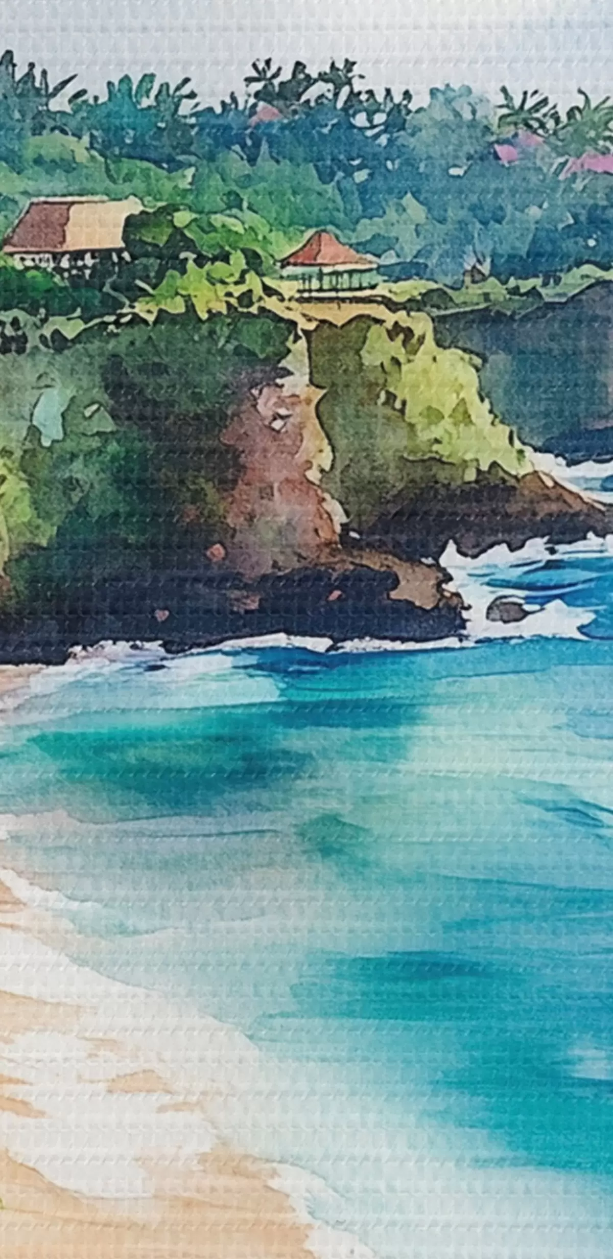 Ronde schilderijen Tropisch oceaanstrand, palmbomen, bloemen, aquarelstijl Nr r44145