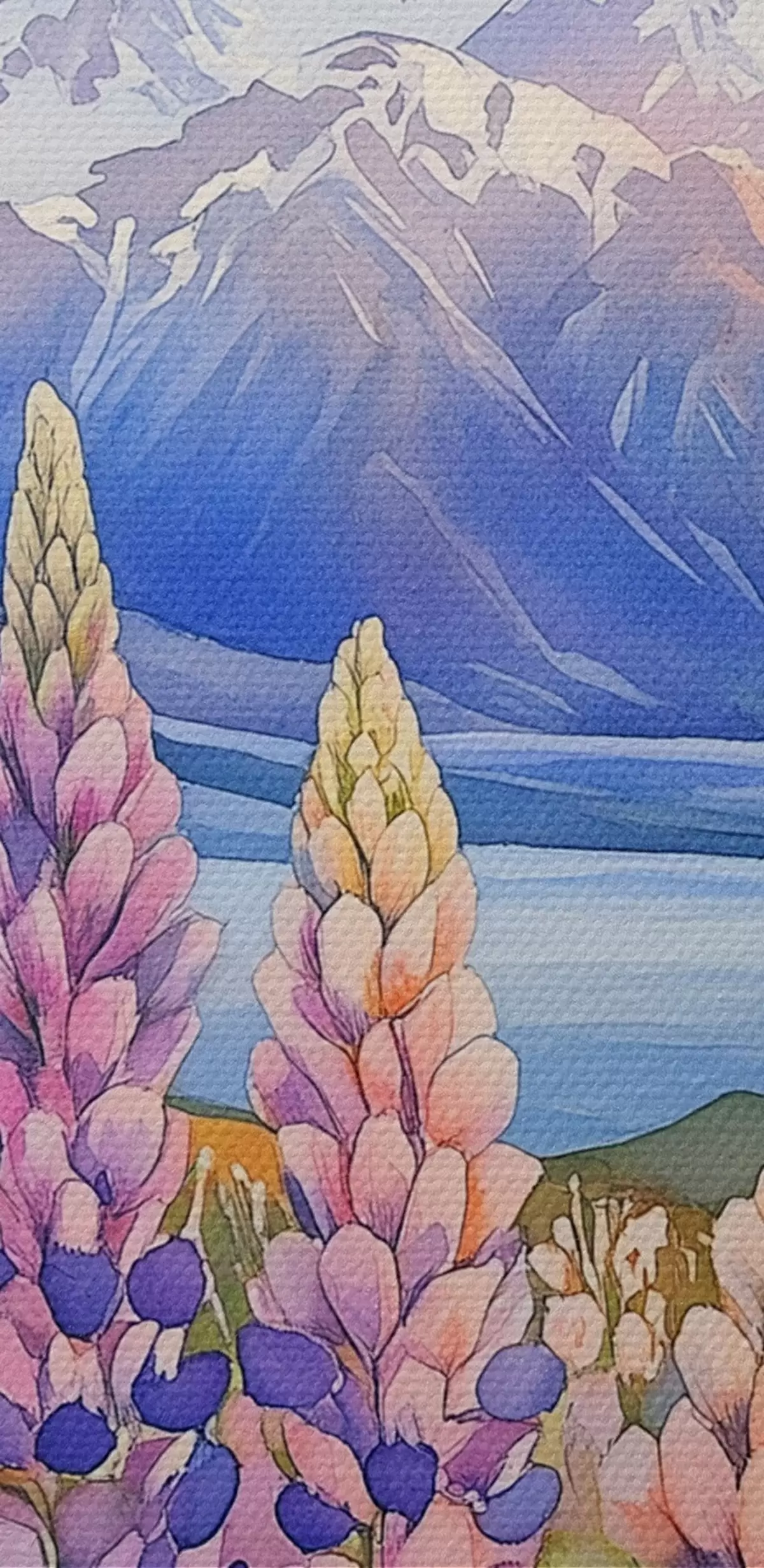 Ronde schilderijen Lupinebloemen, weide, bergen, aquarelstijl, lucht met zonsondergang Nr r44146