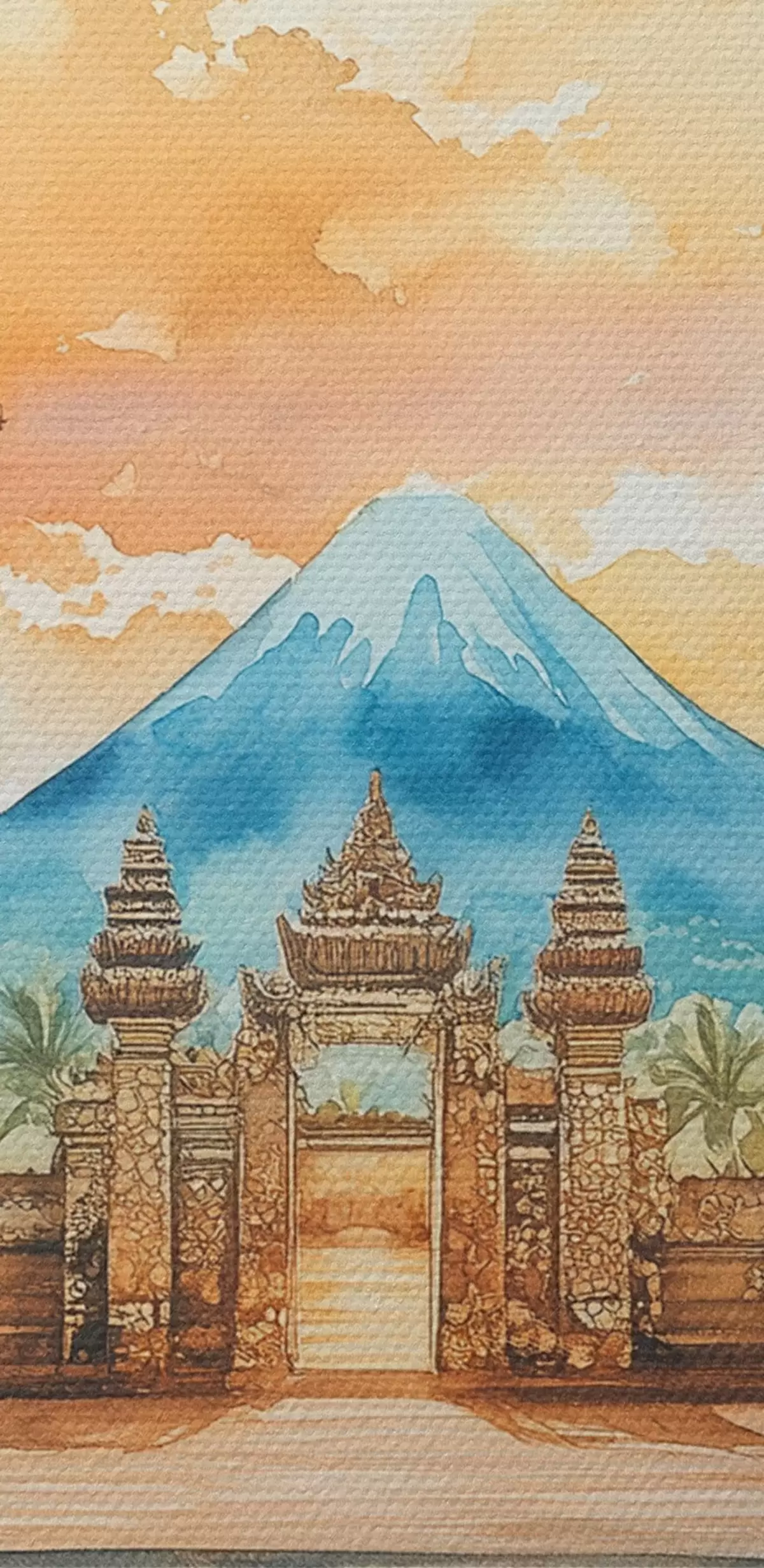 Ronde schilderijen Bali esthetiek, tempel, zonsondergang, tropische natuur, aquarel stijl r44149