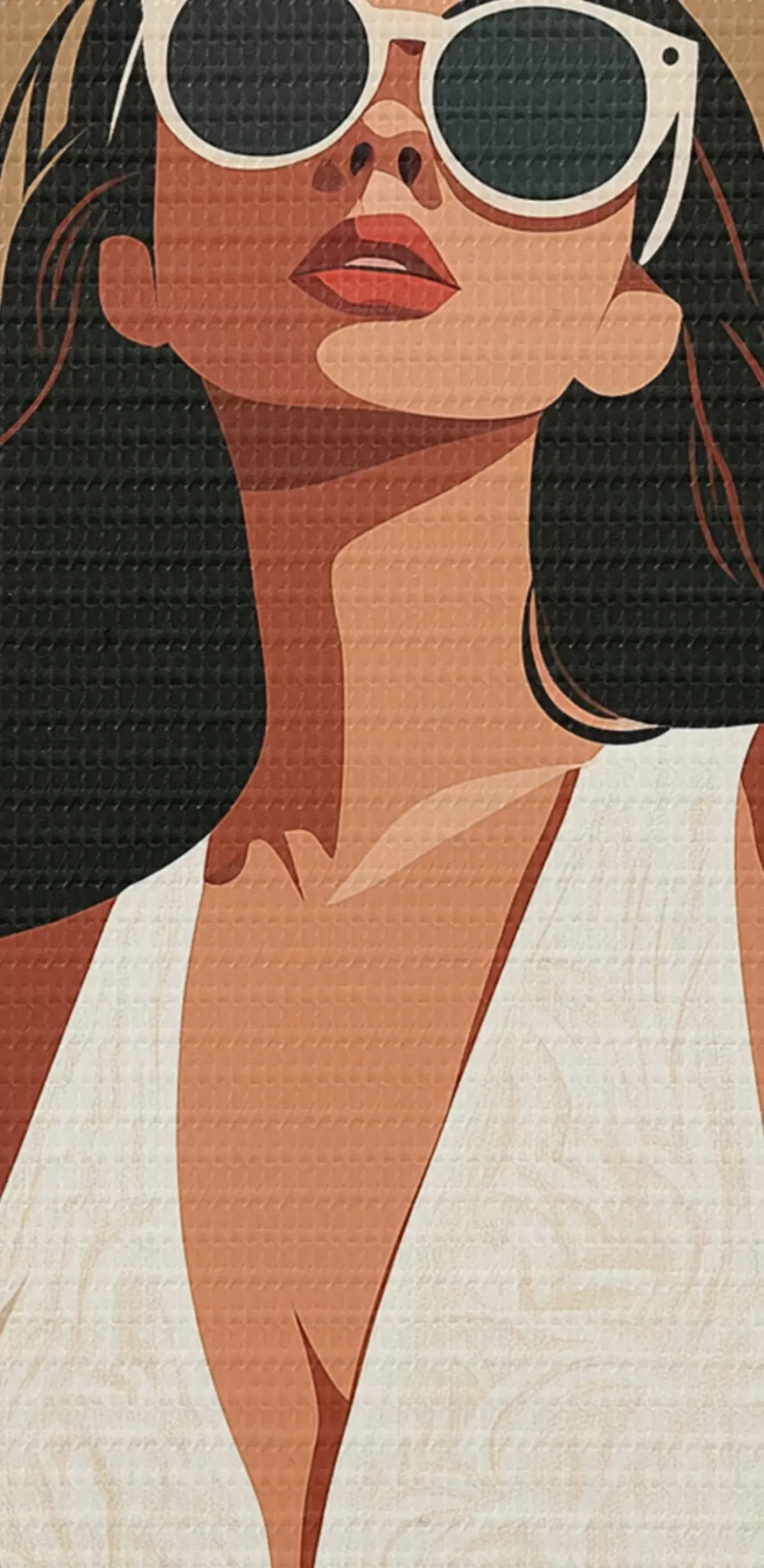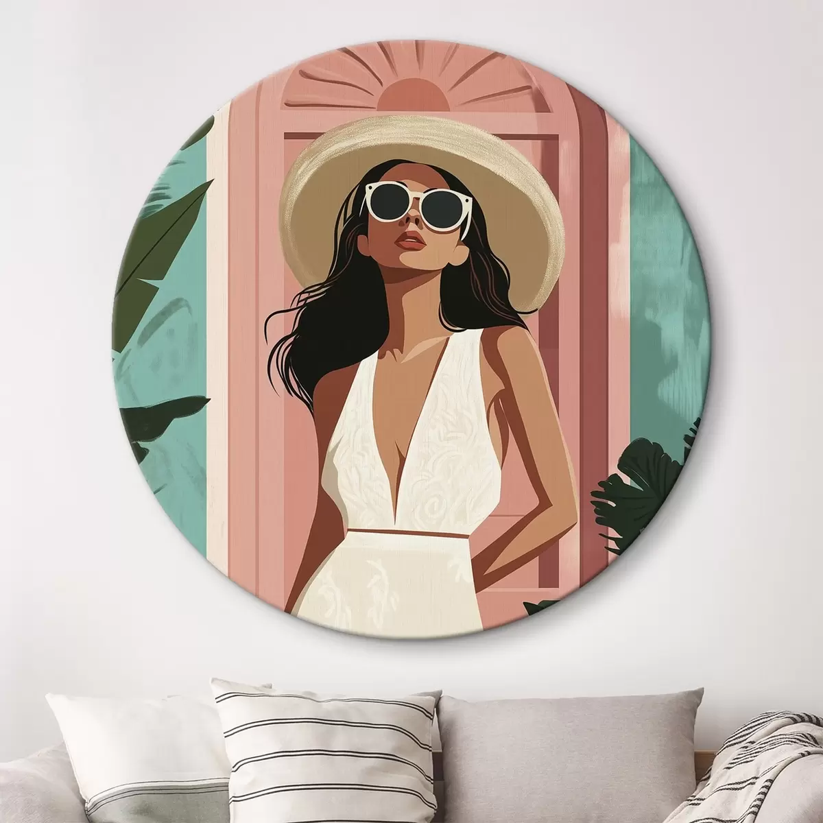 Ronde schilderijen Vrouw met zonnebril en hoed, tropische natuur, architectuur Nr r44152