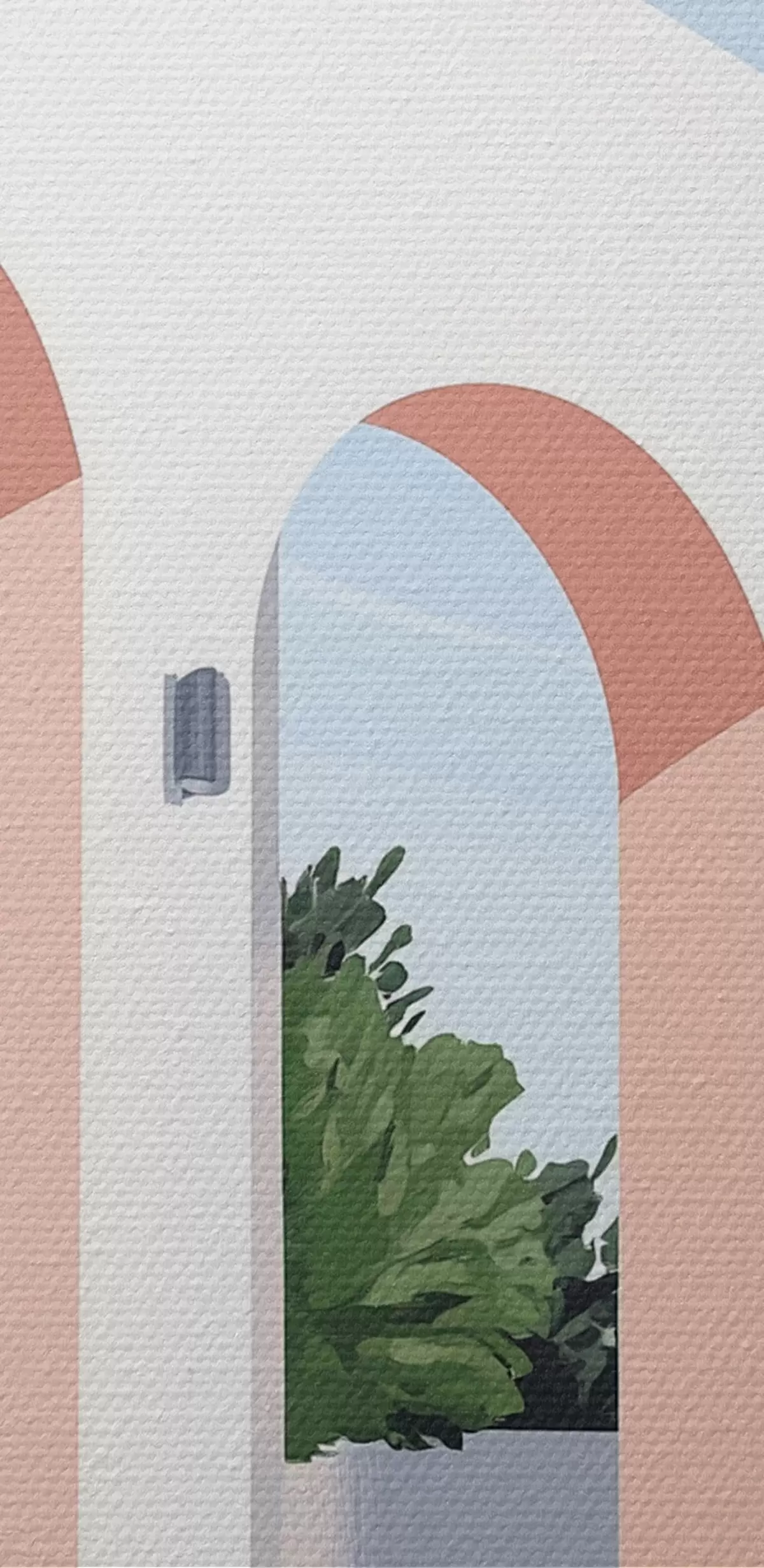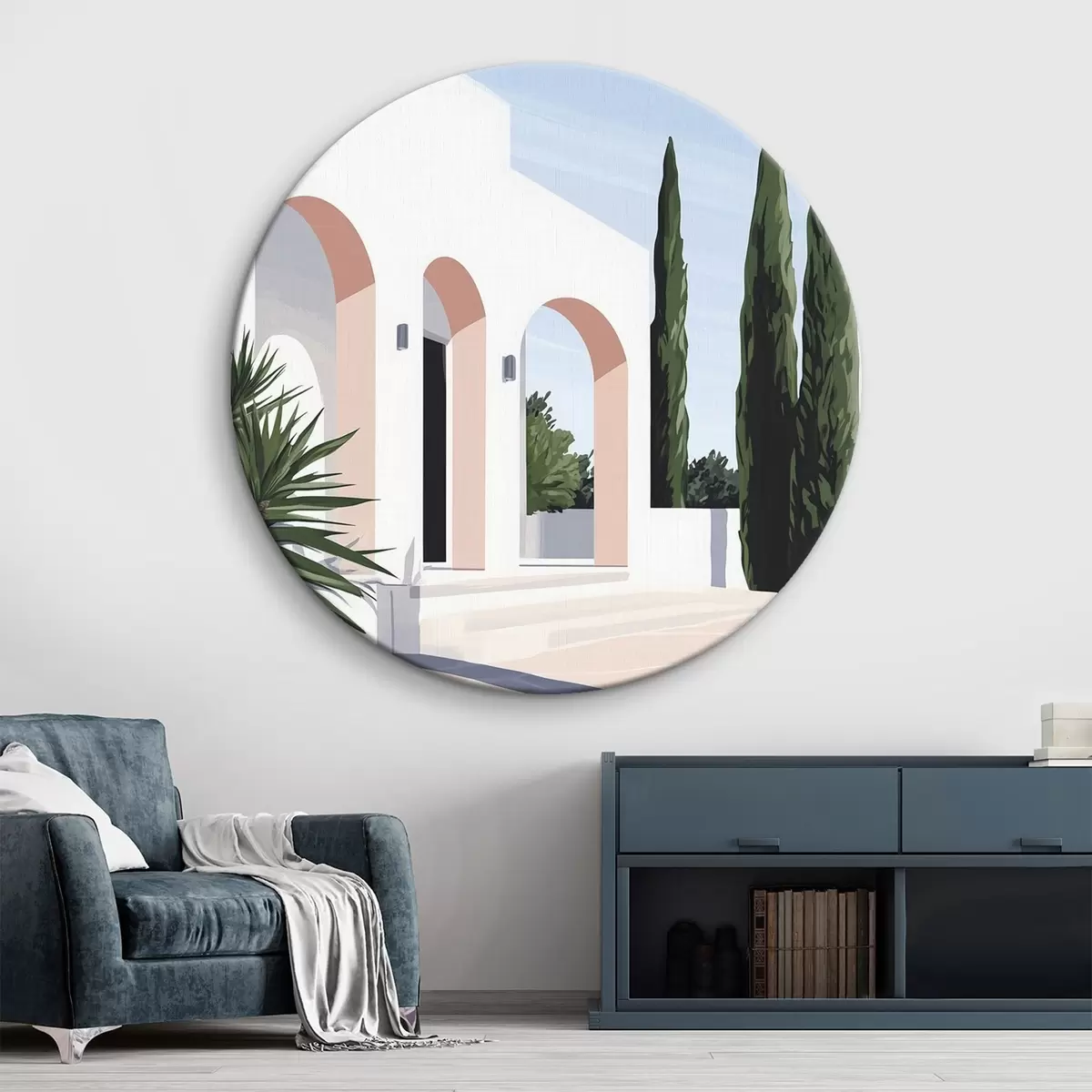 Ronde schilderijen Witte villa met bogen en tropische tuin, mediterrane, vlakke stijl Nr r44153