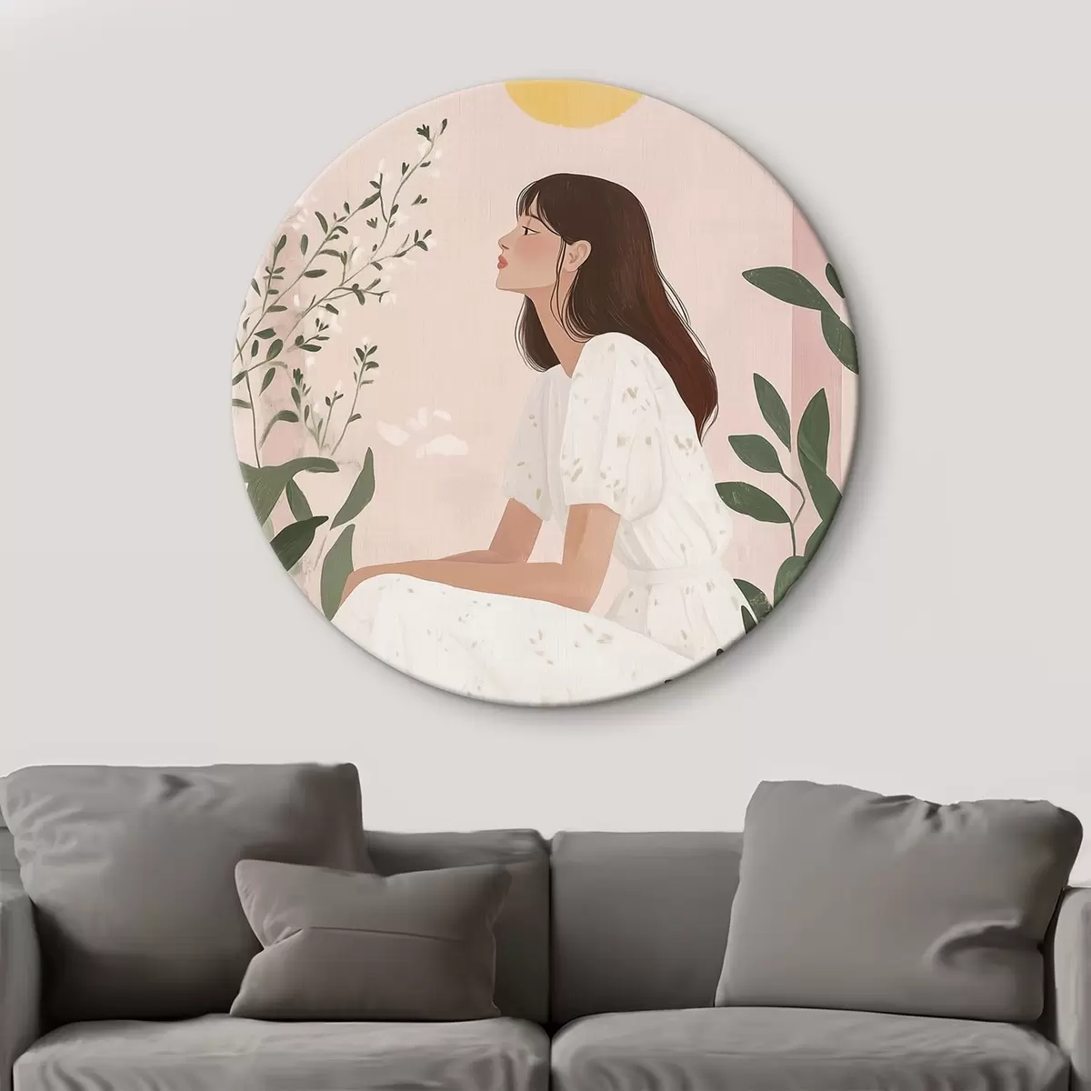 Ronde schilderijen Mooie vrouw in de tropische tuin, zon, pastelkleuren Nr r44155