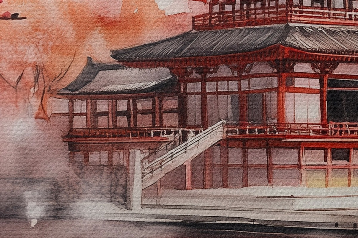 Ronde schilderijen Prachtig Japans landschap met bloeiende kersenboom en huis aan het meer r44310