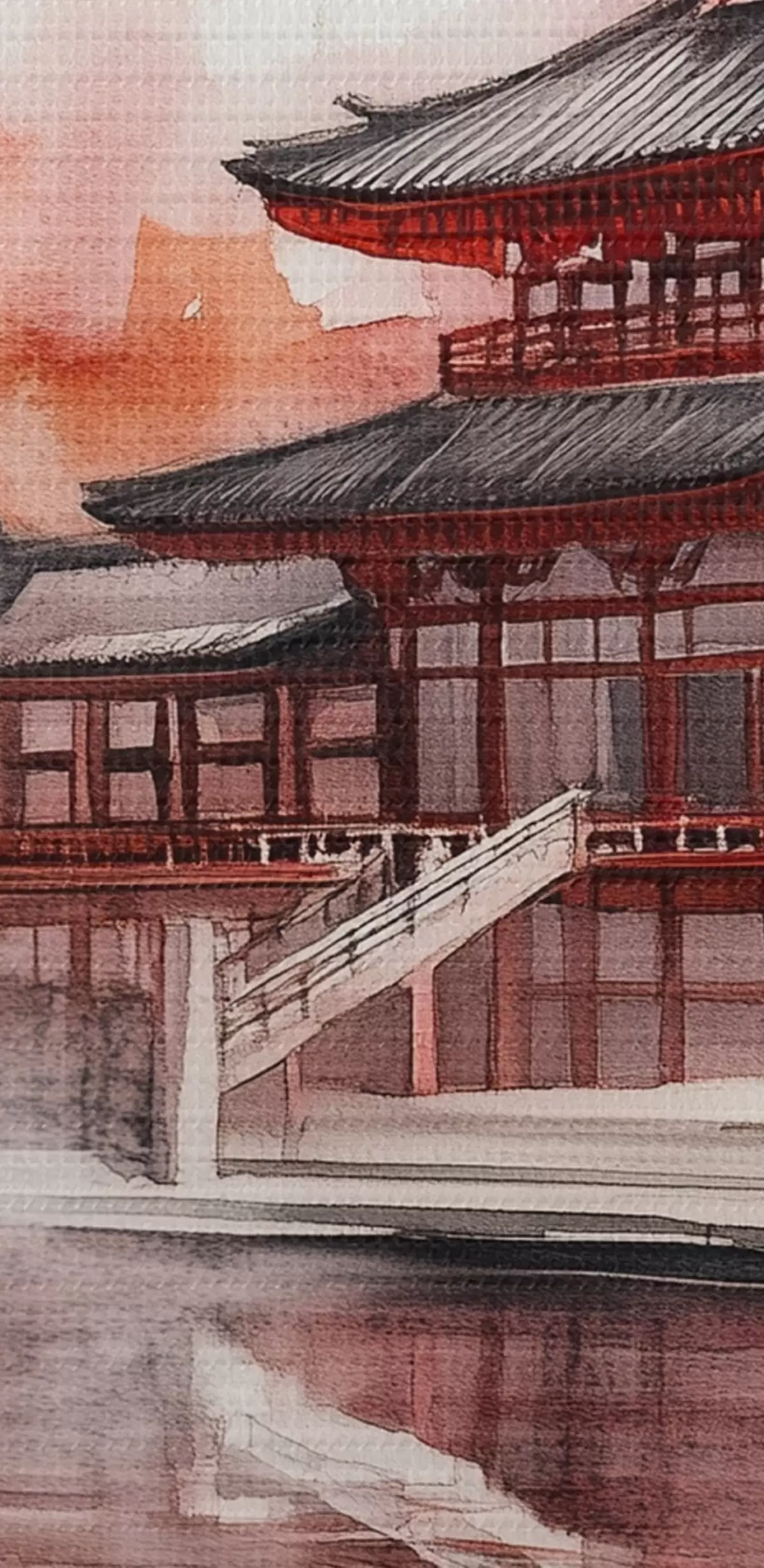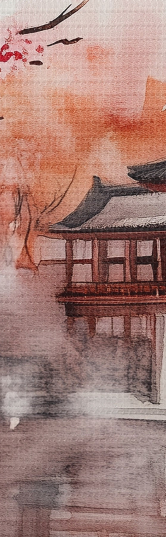 Ronde schilderijen Prachtig Japans landschap met bloeiende kersenboom en huis aan het meer Nr r44310