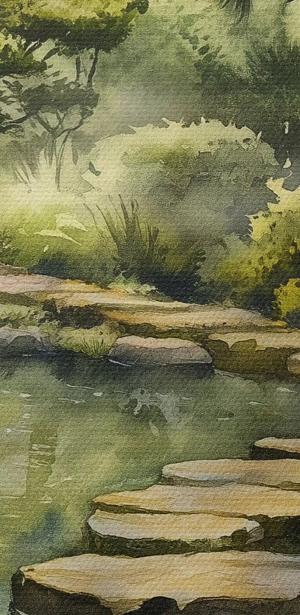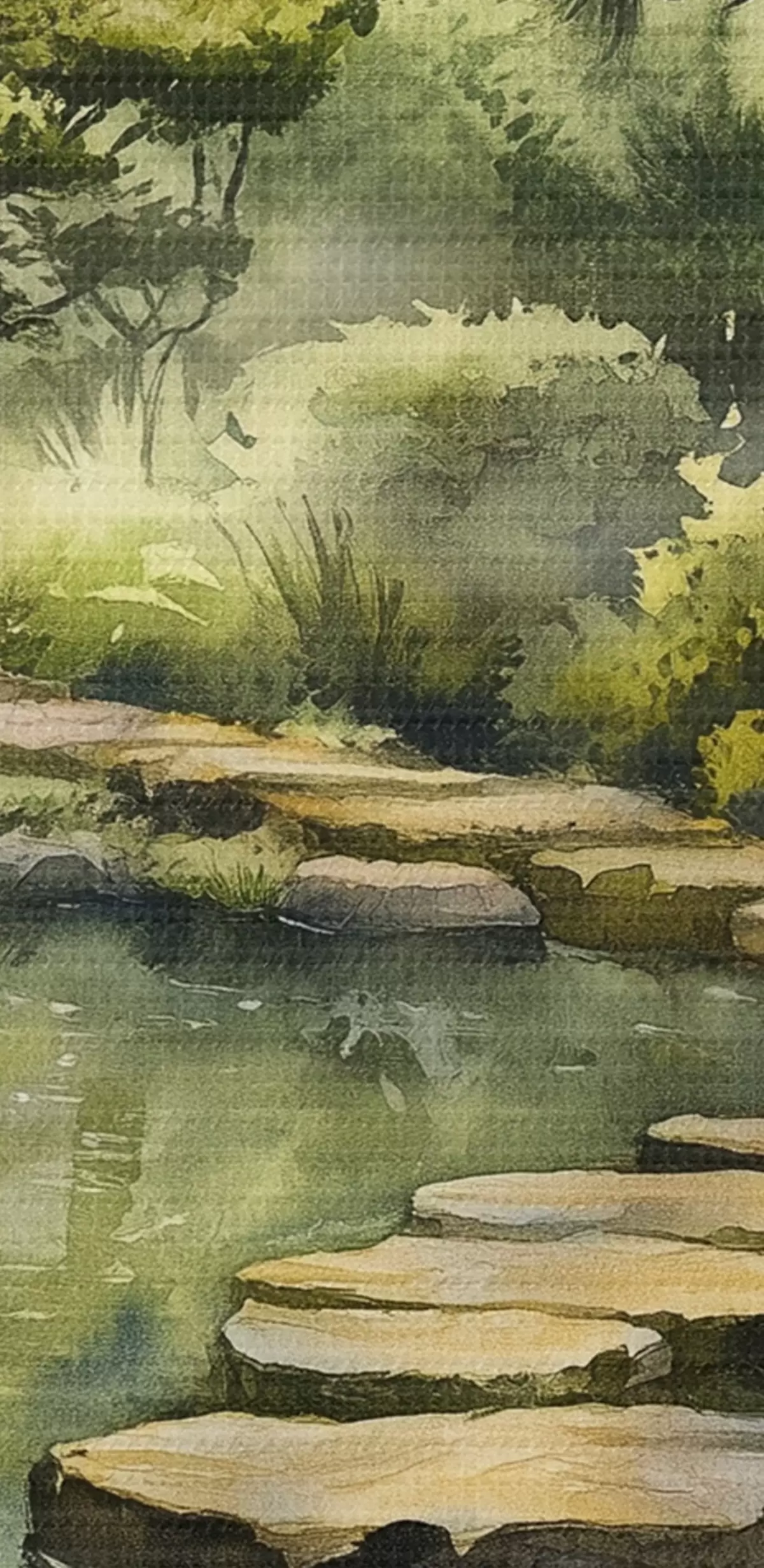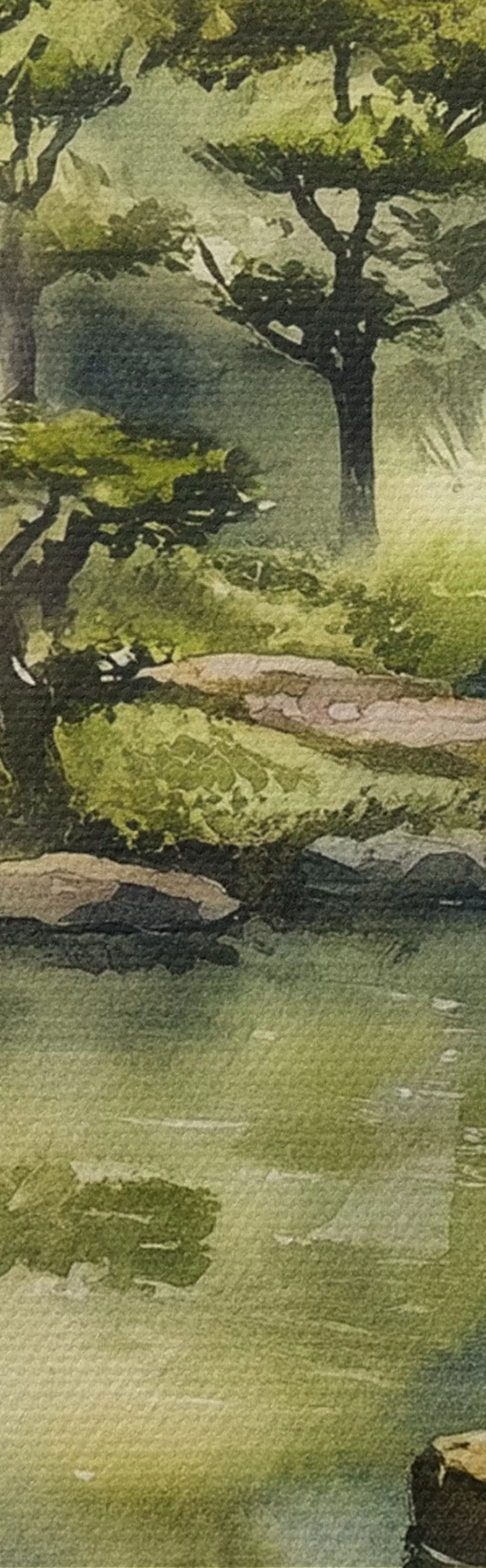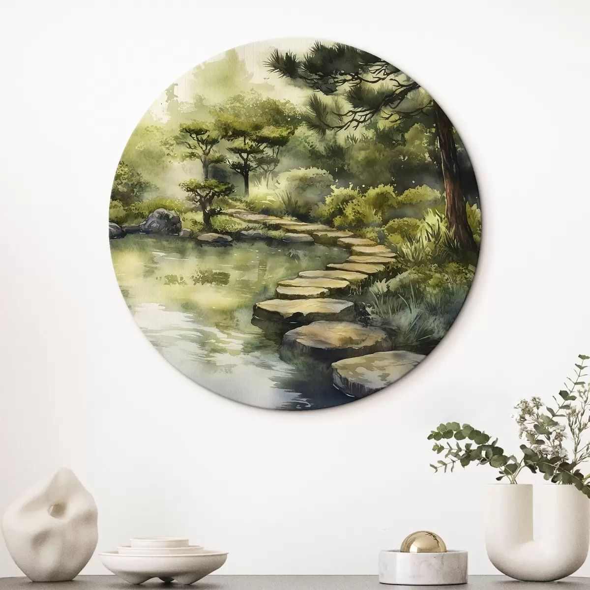 Ronde schilderijen Oosters bos met rotsen, vijver en pijnbomen, groen, aquarelstijl Nr r44311
