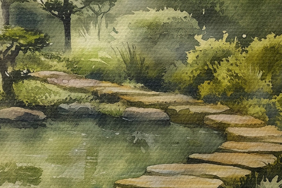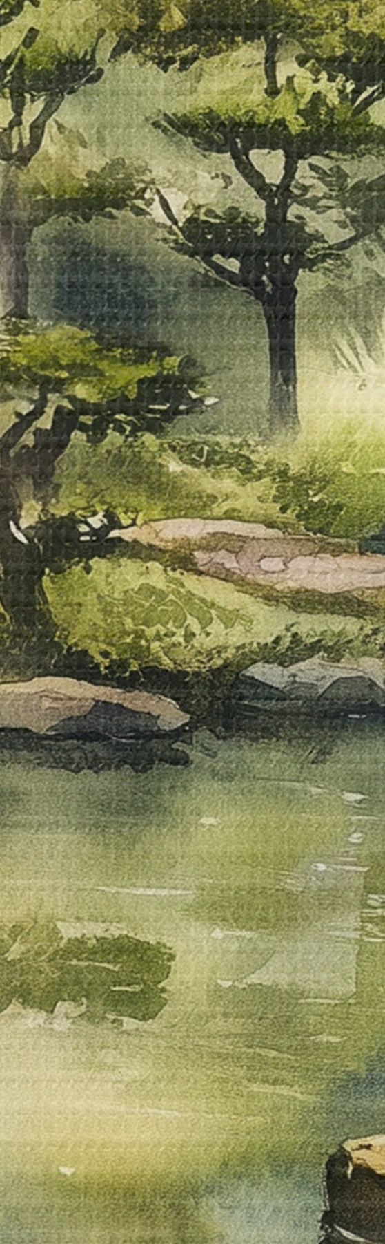 Ronde schilderijen Oosters bos met rotsen, vijver en pijnbomen, groen, aquarelstijl r44311